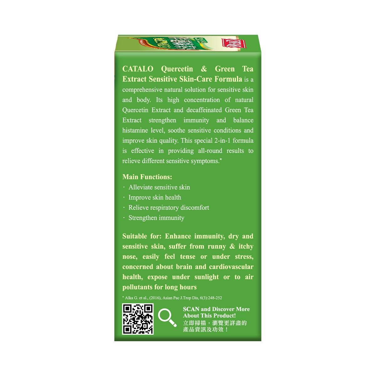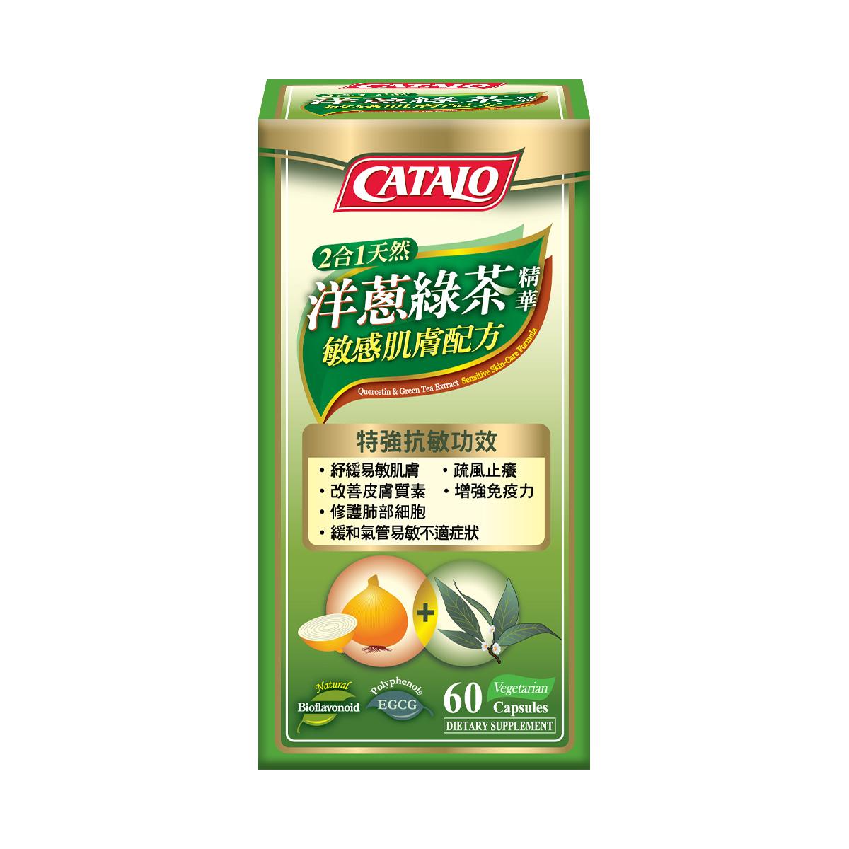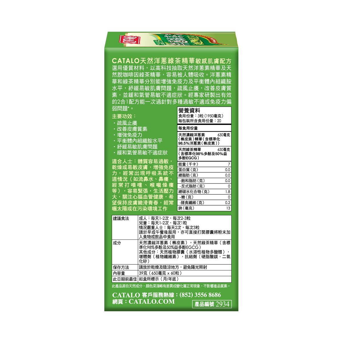 天然洋蔥綠茶精華敏感肌膚配方 選用優質材料,以高科技抽取純天然洋蔥素精華及純天然綠茶精華,容易被人體吸收。洋蔥素精華和綠茶精華分別能增強免疫力及平衡體內組織胺水平,紓緩容易敏感的肌膚問題,疏風止癢,改善皮膚質素,並緩和容易敏感的氣管不適狀況。經專家研製出最有效的2合1配方,再經過脫咖啡因工序,能一次過針對多種過敏不適或免疫力偏弱問題*。