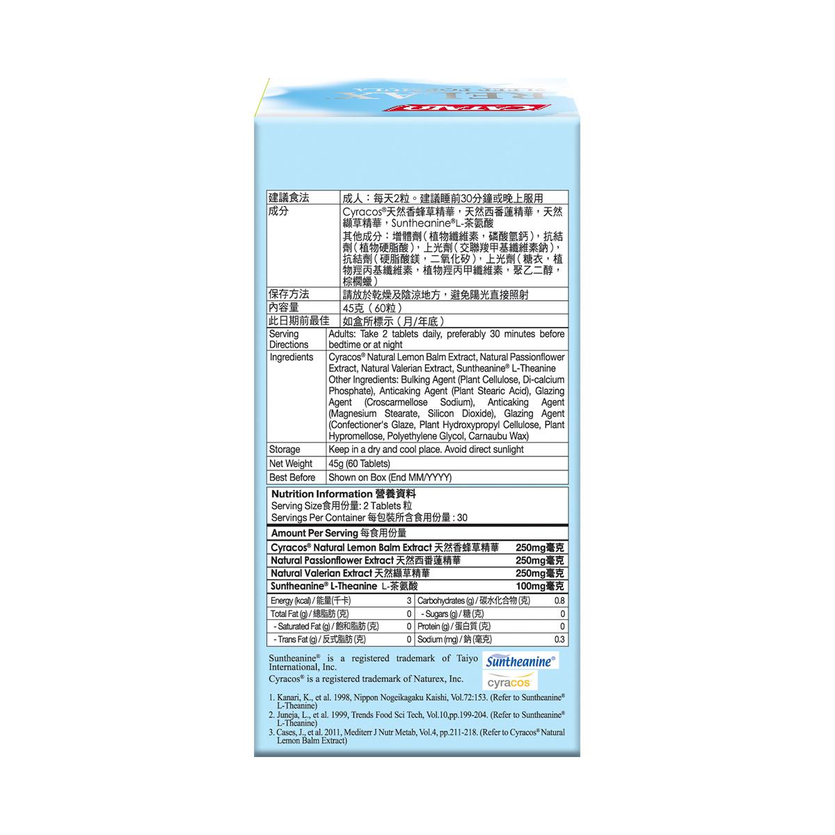 Cyracos®天然香蜂草精華,天然西番蓮精華,天然纈草精華,Suntheanine®(純L-茶氨酸)其他成份:增體劑(植物纖維素,磷酸氫鈣),抗結劑(植物硬脂酸,植物硬脂酸鎂,二氧化矽),上光劑(交聯羧甲基纖維素鈉,糖衣,植物羥丙基纖維素,植物羥丙甲纖維素,聚乙二醇,植物棕櫚蠟)