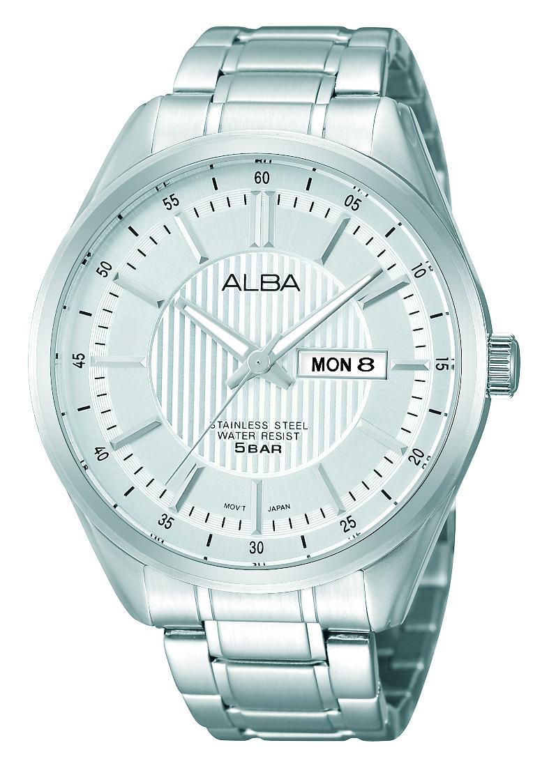 银色表面 不锈钢表壳和表带 矿物玻璃镜面 旋入式背盖 星期日期显示 日常生活防水(50米)
