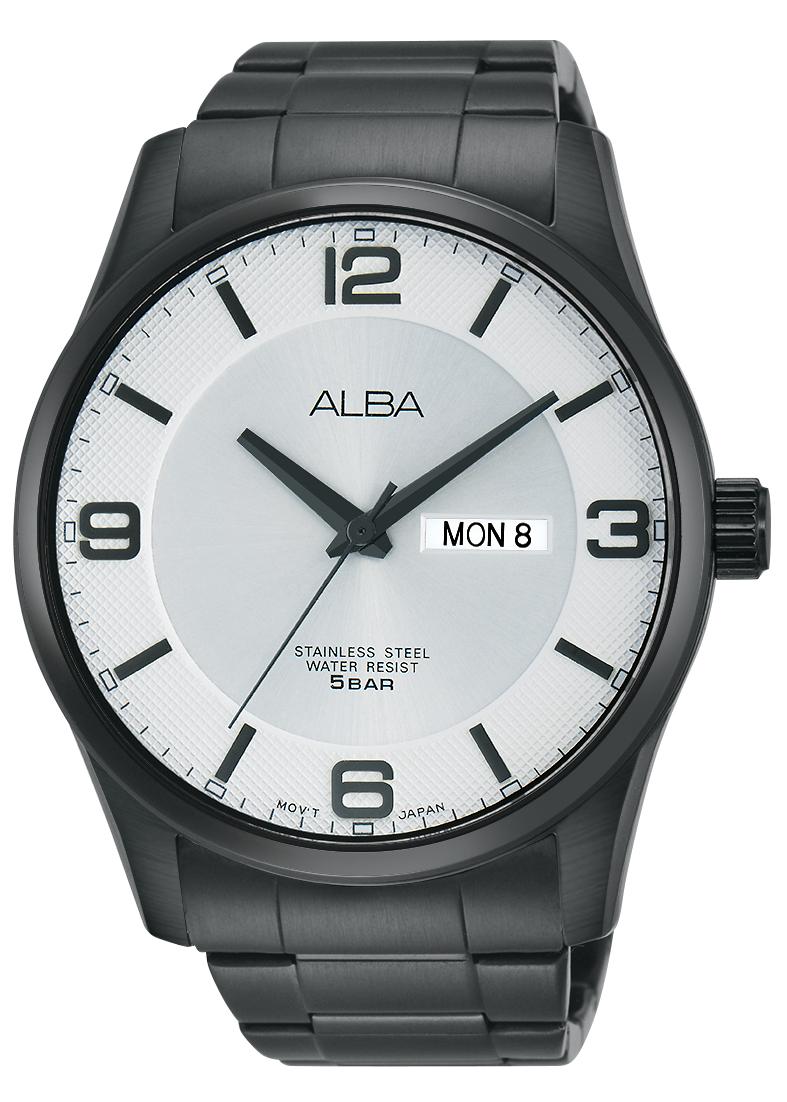 白色錶面不鏽鋼錶殼和錶帶弧形強化玻璃鏡面旋入式背蓋 星期日期顯示 日常生活防水(50米) 錶盤直徑:45mm