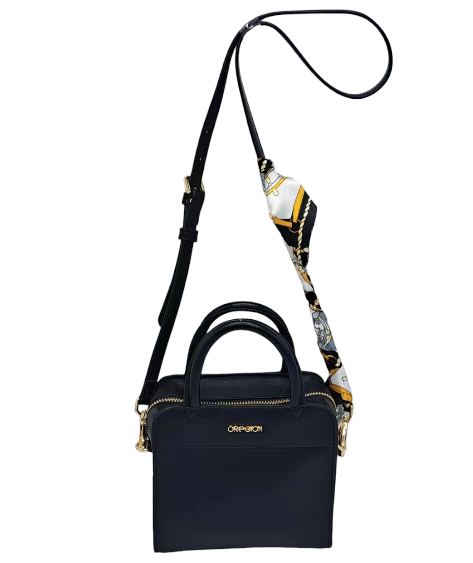 全新優雅時尚的仿皮手挽包。肩帶上飾有絲巾,增添時尚氣息。非常適合晚宴和任何聚會。