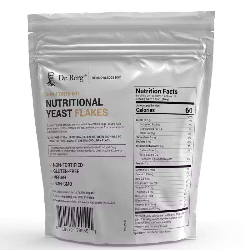使用Dr. Berg 营养酵母片,增加风味和营养。我们的营养酵母是非强化的,富含天然矿物质和B族维生素。在你最喜欢的食物上撒一些,让家常菜栩栩如生。每袋包含14份美味的食物。美国制造,无麸质,素食主义者友好,非转基因。 描述 使用Dr. Berg 营养酵母片是支援健康身体的美味方式。每份都富含 B 族维生素、微量矿物质、氨基酸和纤维。与其他富含合成B族维生素和添加剂的营养酵母产品不同,我们的营养酵母仅含有自然界中的维生素和矿物质。这最大限度地提高了营养吸收和生物利用度。 您一定会爱上我们营养酵母片的咸味。在你最喜欢的食物上撒一些,让家常菜栩栩如生。美味的奶酪和坚果味与色拉、烤蔬菜、汤、酱汁、砂锅菜、鸡蛋、羽衣甘蓝薯片等完美搭配。 每袋营养酵母片包含 14 份。我们的营养酵母不含麸质、素食主义者、酮症友好、非转基因,并在美国制造。