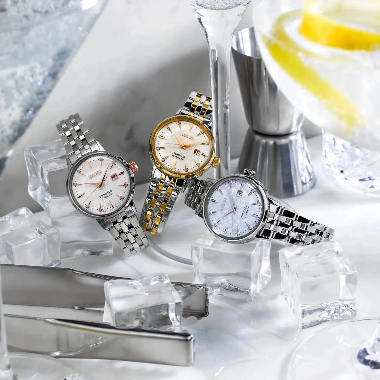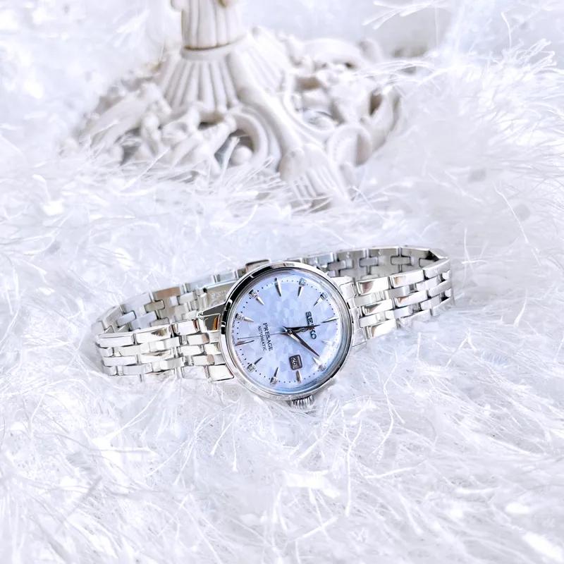 Presage调酒系列新推出女表,美丽的面盘另人联想柔和的调酒,8颗美钻点缀在面盘上,再加上复古感的箱型玻璃镜面,展现出优雅的氛围。