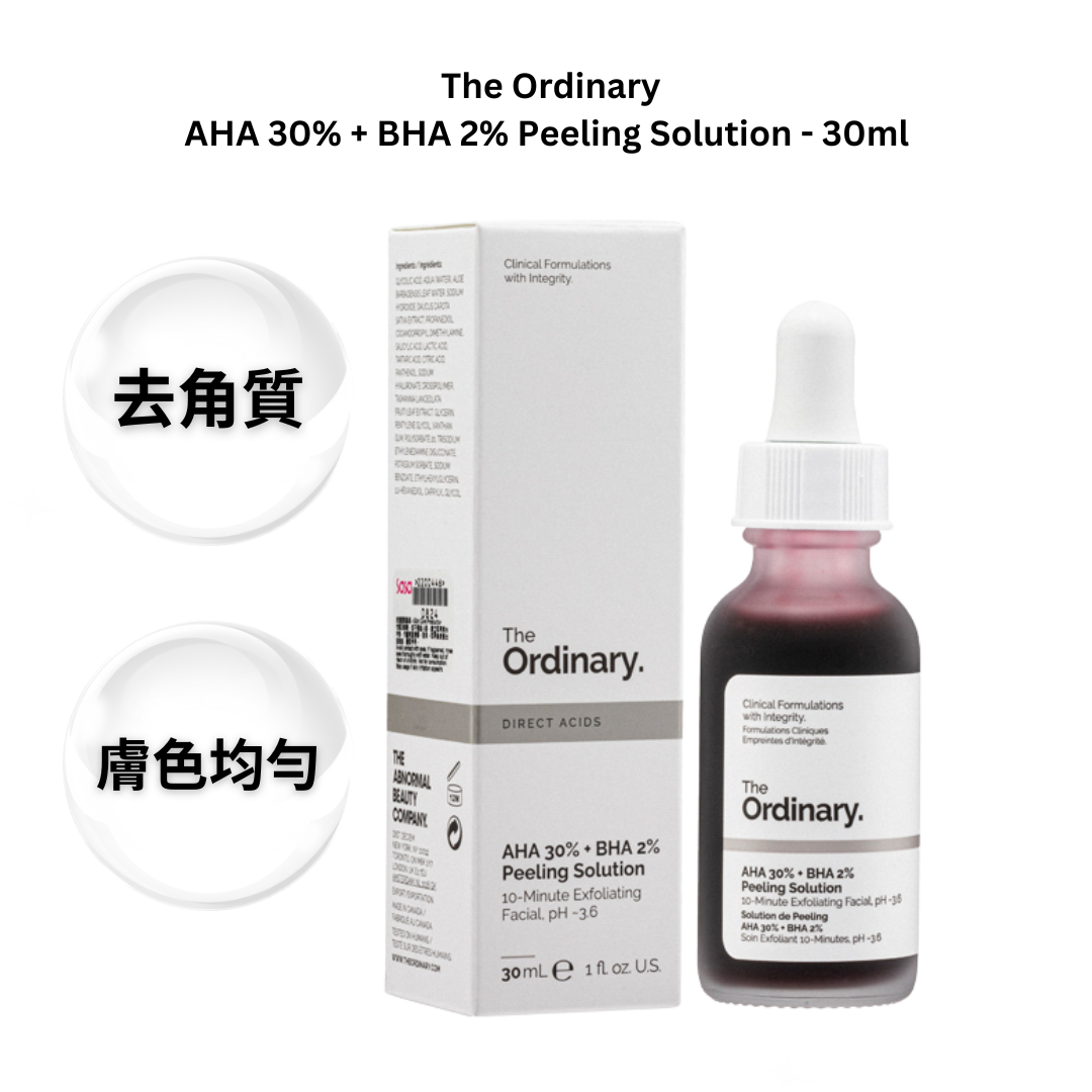 AHA 30% BHA 2% Peeling Solution 30%果酸 2%水楊酸去角質面膜,水質基底,富含果酸和水楊酸成分。 產品功效 本款面膜可有效去除肌膚多層角質,消滅粉刺痤瘡,讓膚色均勻亮澤。定期使用可改善肌膚紋理,淡化撫平細紋。 使用方法 清潔並擦乾肌膚後,取少量塗於面部,在10分鐘內用溫水洗淨。 每週最多使用兩次,建議晚間護膚時使用。敏感、起皮或受損肌膚不宜使用。 果酸會令肌膚對紫外線輻射更為敏感。使用本品期間,請塗抹防曬霜,穿上防護衣物,盡量避免讓肌膚暴露於陽光下。