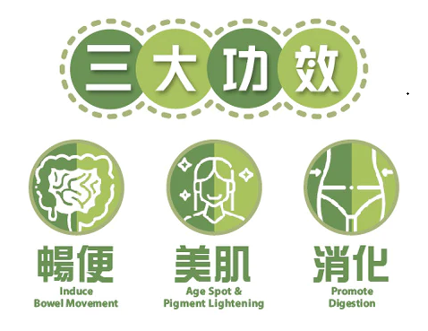 23種超級ABC益生菌能促進消化和清除腸道淤積毒素,加強排便效果。 207種天然蔬果酵素能有效促進新陳代謝及腸道消化,改善膚質,達至美肌、淡斑及預防便秘。 洋車前子麩皮纖維含有水溶性和非水溶性纖維,助長腸道益生菌、增加腸道蠕動及有助排便。 活性乳酸菌及綠茶幫助暢便及排毒,增加腸道蠕動及有助排便 澱粉分解酵素及脂肪分解酵素幫助維持腸道健康,促進消化 半乳寡糖能改善及維持腸道健康 甲殼素能阻止油脂吸收,達至修腰、收腩效果