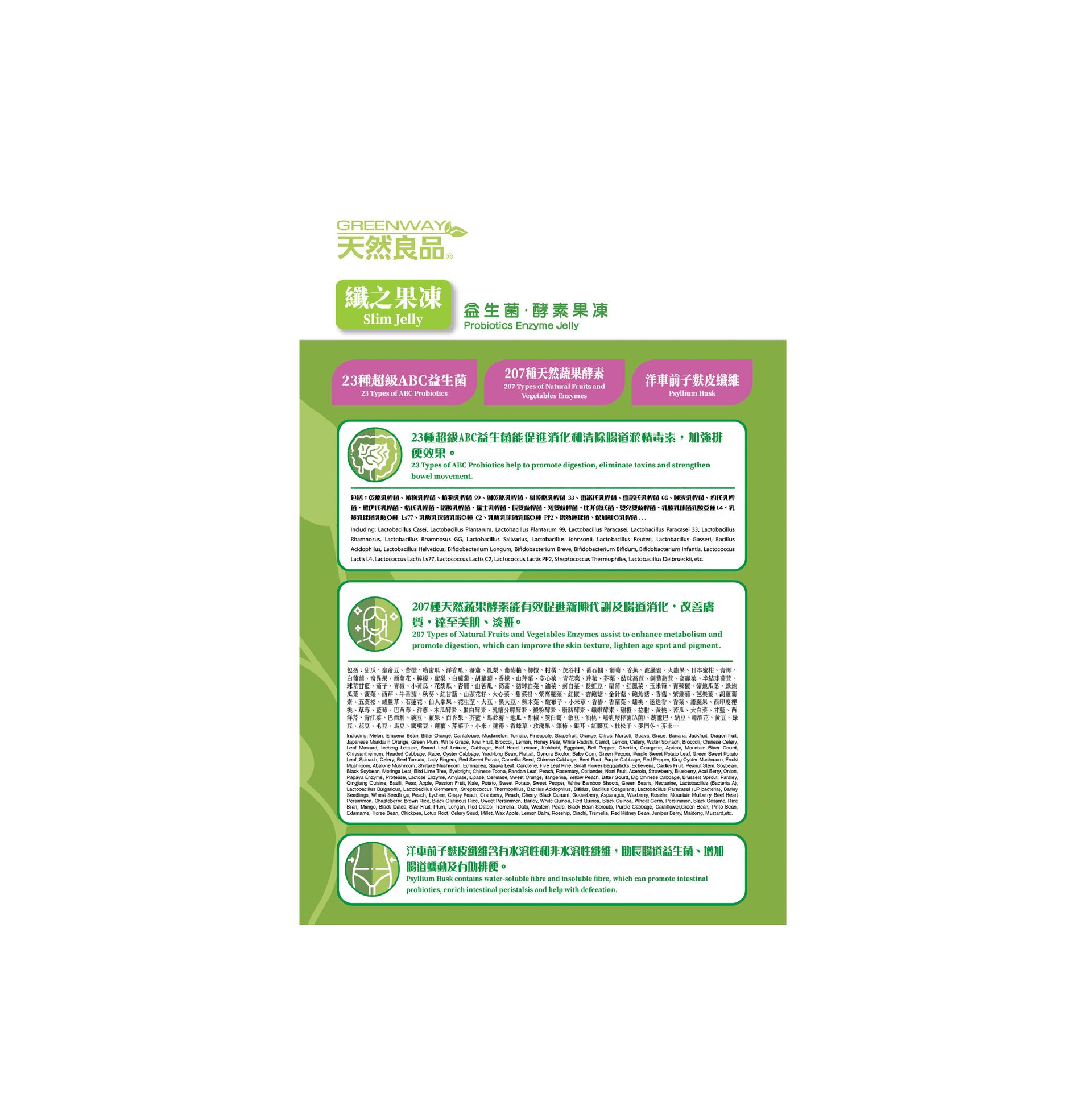 「天然良品 - 纖之果凍 - 益生菌.酵素果凍」在台灣製造,使用23種超級ABC益生菌、207種天然蔬果酵素及洋車前子麩皮纖維,有助暢便、排毒、收腩、消化、美肌、淡斑,功效顯著。