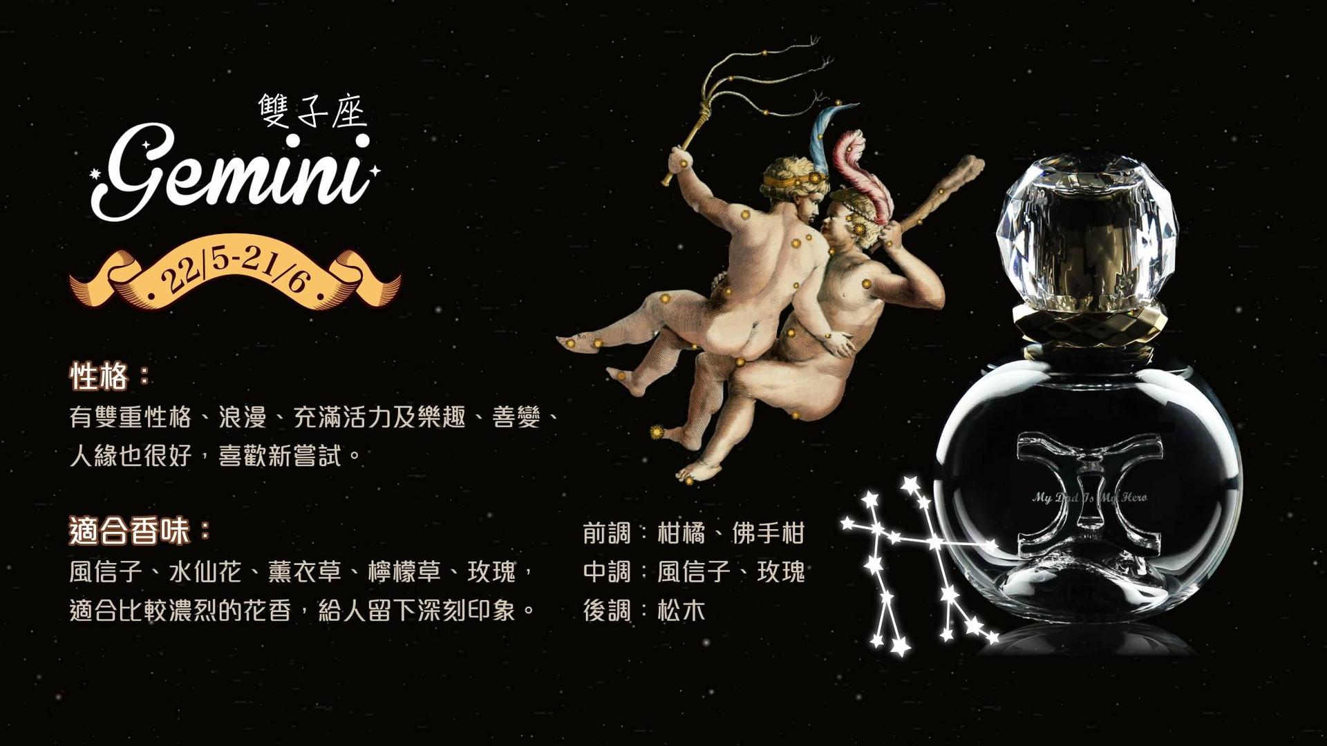 雙子座有雙重性格、浪漫、充滿活力及樂趣、善變、人緣也很好,喜歡新嘗試。適合比較濃烈的花香,給人留下深刻印象。