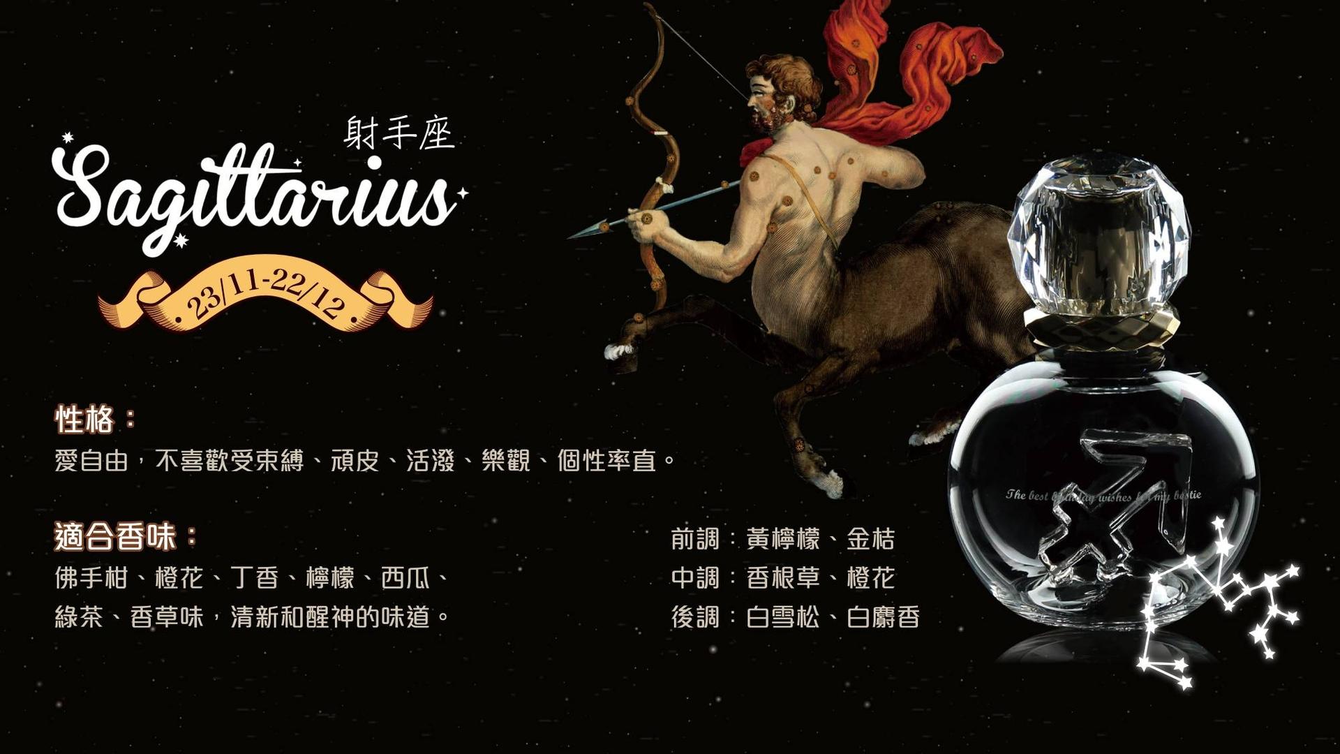 人馬座愛自由,不喜歡受束縛、頑皮、活潑、樂觀、個性率直。適合清新和醒神的味道。