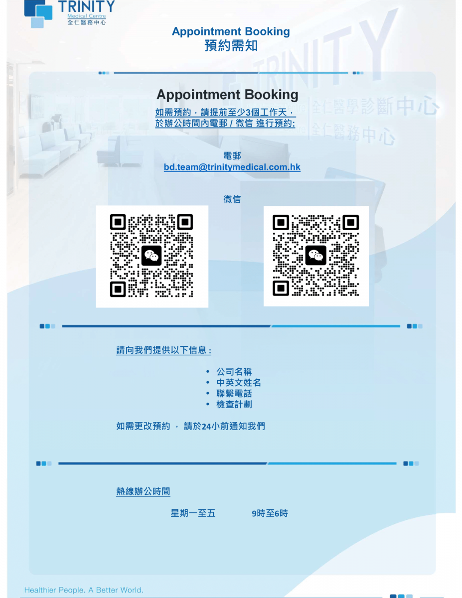 5. Trinity reserves the right to make any amendments to the terms and conditions. All decisions made by Trinity shall be final and binding. 全仁醫務中心保留一切修訂,如有任何爭議,全仁醫務中心保留最終決定權。
