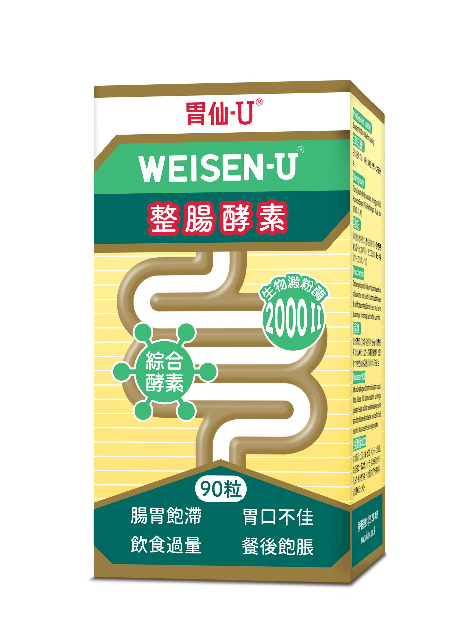 胃仙-U整腸酵素內含綜合酵素,有助幫助脂肪、碳水化合物、蛋白質、纖維素的消化,減低胃部的消化負擔,方便身體吸收食物營養,新配方的生物澱粉酶澱粉分解力比糖化酶強十倍。