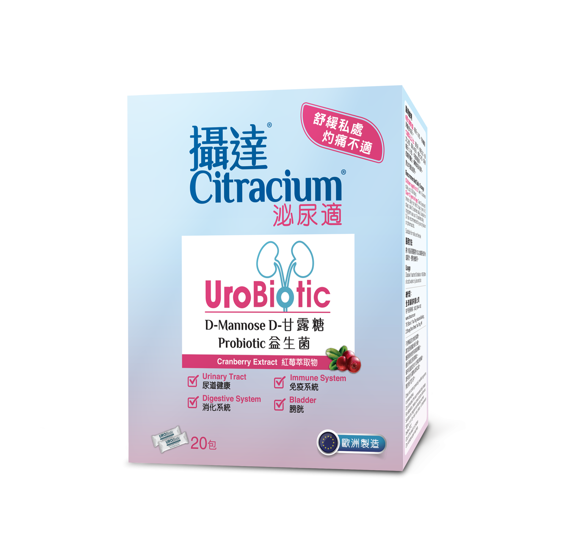 攝達®泌尿適,歐洲製造,有效保持尿道健康、清潔、無異味 在尿道的表面形成阻止有害微生物的入侵的天然屏障 蘊含三重有效成份,能維持尿道健康、增強免疫力,舒緩尿道灼痛不適