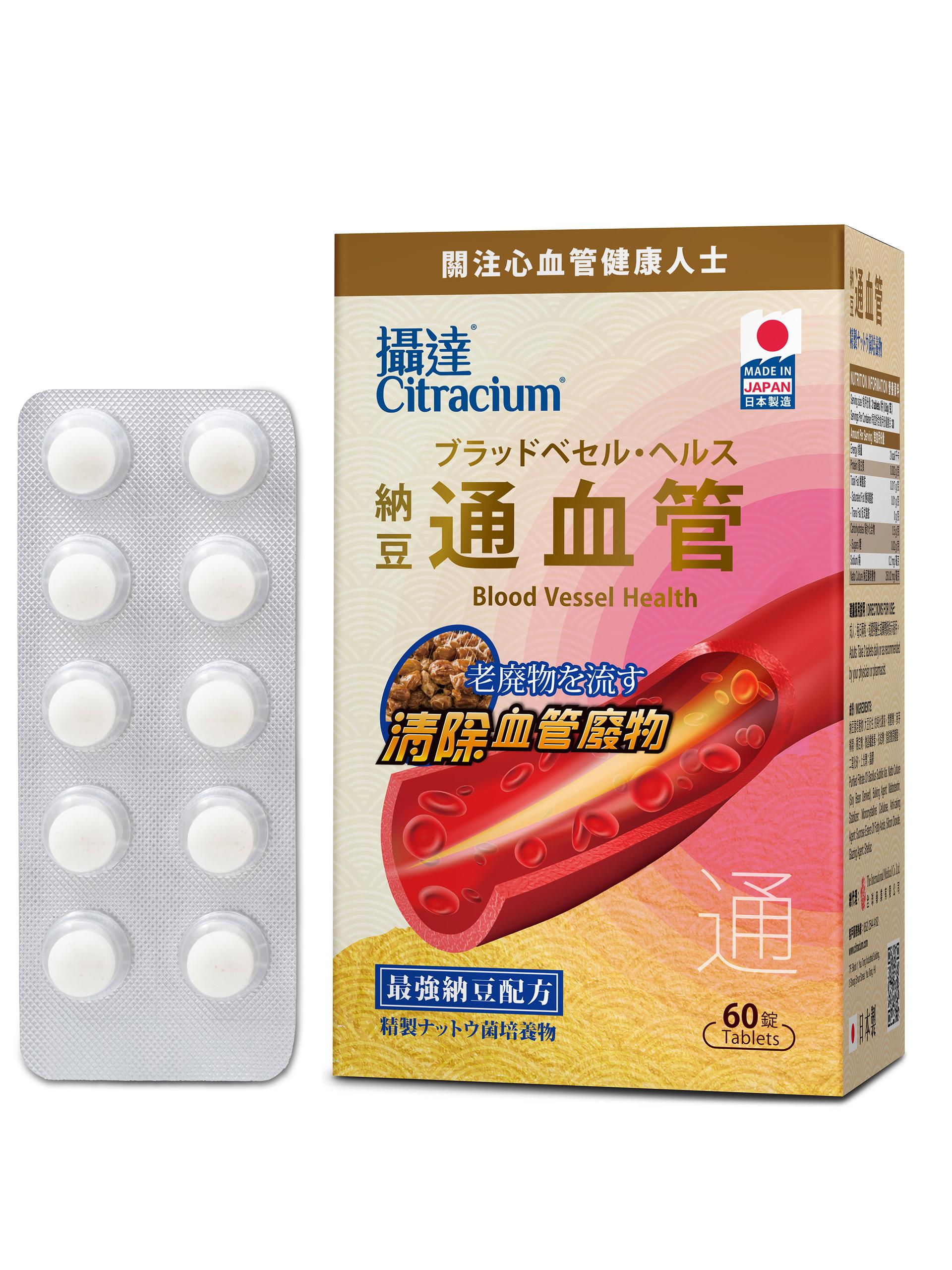 攝達納豆通血管,日本製造,能有效溶解血管廢物,平衡血液黏度,暢通血管、改善血液循環及三高問題、保護心血管健康及改善手腳麻痺。