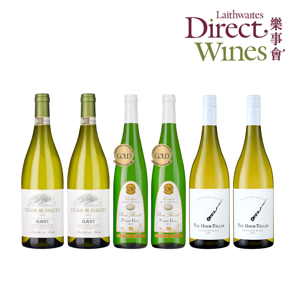 - 白酒迷看過來!樂事會為您獻上絕美風味白酒,點亮派對的團聚時刻 - 這是您不容錯過的絕美套裝──精選自暢銷人氣、酒迷最愛與頂尖品質的世界白酒,就跟著樂事會的腳步一同環遊世界 - 歡聚時刻必備!芬芳清新、燒烤必備的白酒精選 - 清爽迷人、裝滿盛夏的美味酒選,將經典白酒滋味發揮地淋漓盡致! 2支Vigne del Pareto Gavi 2019, Gavi DOCG意大利 2支The Hour-Teller Sauvignon Blanc 2021, East Coast紐西蘭 2支Pierre Brecht Cuvée VF Pinot Gris 2019, Alsace AOC法國