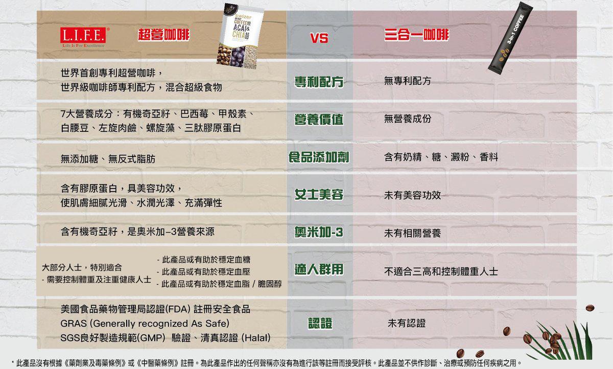 世界首創專利超營咖啡,世界級咖啡師專利配方,混合超級食物,如巴西莓、骨膠原、螺旋藻、有機奇亞籽及精選咖啡,味道香濃幼滑。有機奇亞籽更獲日本JAS, 歐盟EU和美國USDA有機認證。