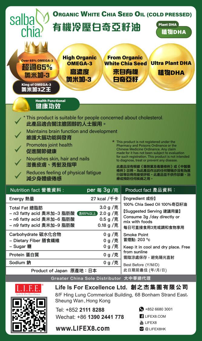 有機冷壓初榨白奇亞籽油 是脂肪酸含量最豐富的油,奧米加3之王,高達65%以上,是所有植物奧米加-3來源中含量最高的一種。有機奇亞籽油亦含有很強的抗氧性能,抗衰老,亦能當護膚精華滋養皮膚,重置肌膚,喚醒底層細胞,為身心建立一層保護膜。