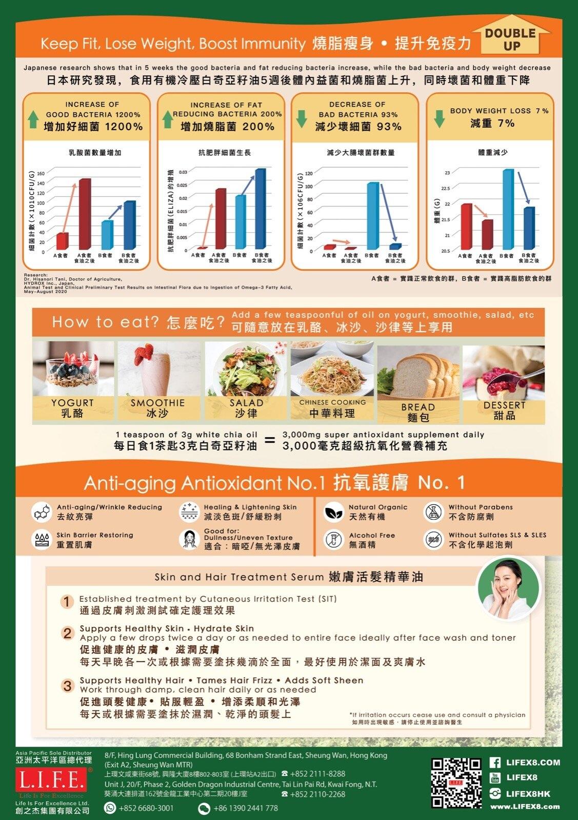食用有機冷壓百奇亞籽油5週後體內益菌和燒脂菌上升,相反壞菌和體重下降