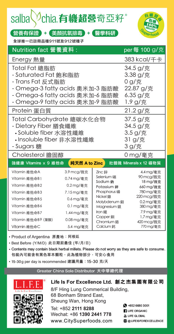 有機超營奇亞籽是來自阿根廷的鼠尾草種子。它獲得加拿大多倫多大學醫學院臨床醫學使用,每年只採摘兩次成熟的種子(全球唯一有註冊的#911號、#912號),保證質量。經美國及日本驗證,奧米加-3之王 (α-亞麻酸)含量比其他品種高達30%*,對身體具消炎及抗衰老作用,促進小朋友腦部發育。
