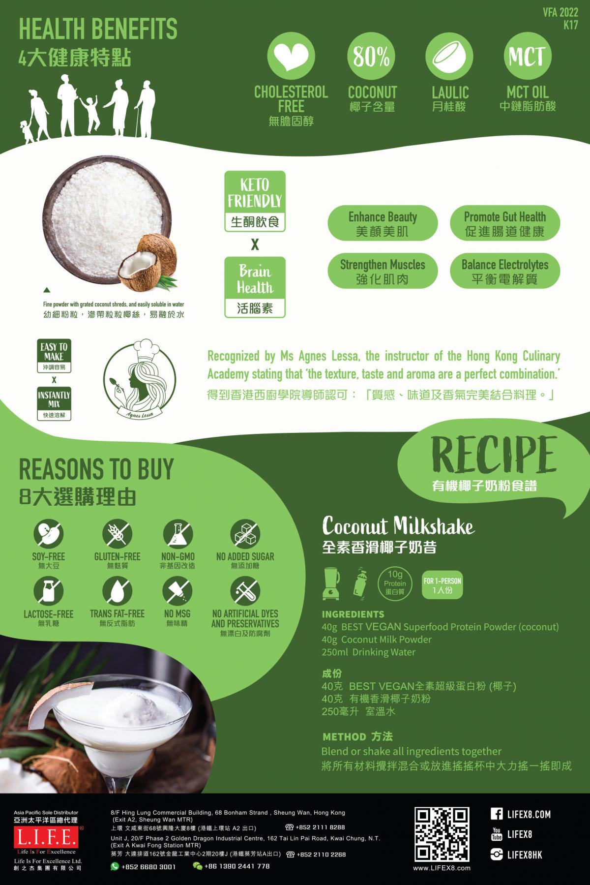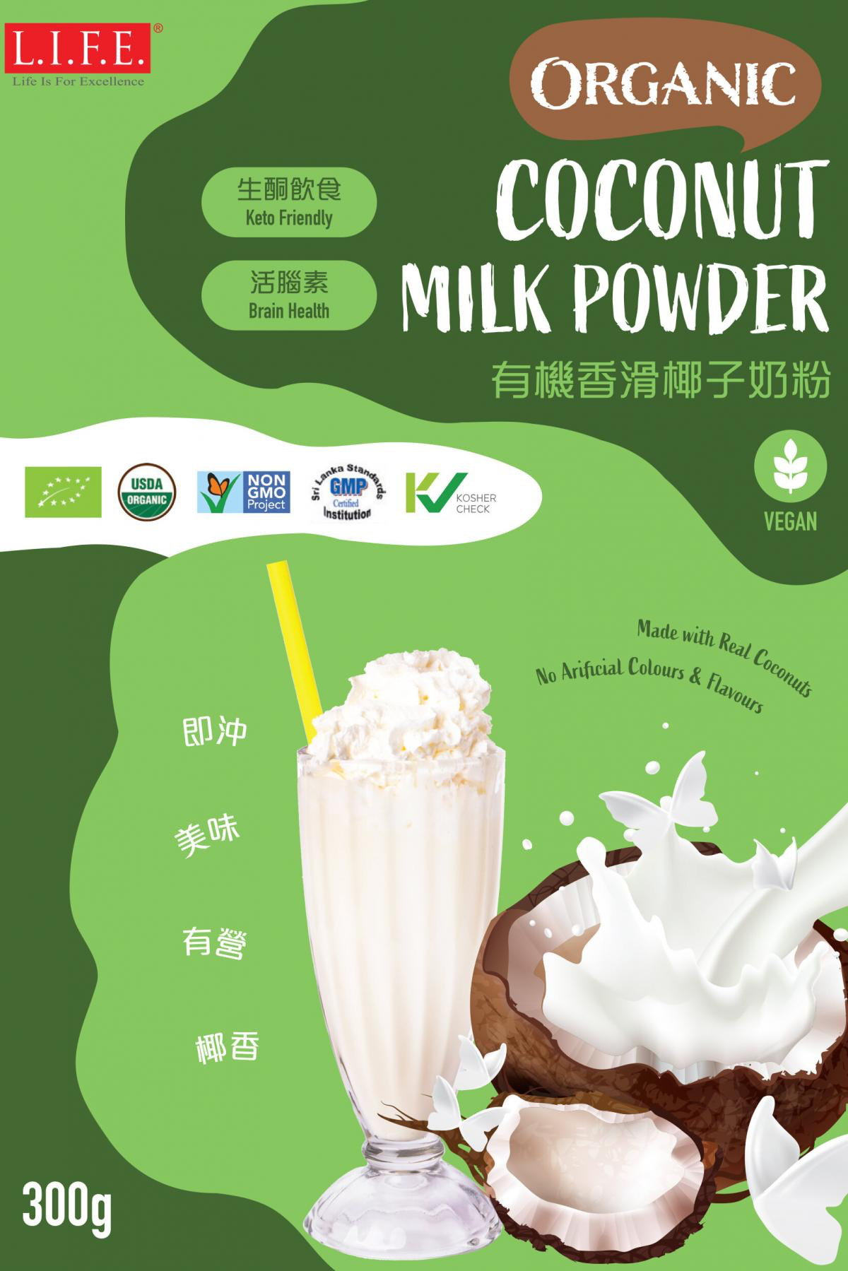 LIFE的有機香滑椰子奶粉來自斯里蘭卡帝王椰子樹,將有機的成熟椰果肉脫水後研製磨成粉末。有機香滑椰子奶粉擁有獨特豐盈的椰子香味,可簡易地以水調和,得到無需添加白糖的美味營養飲品。