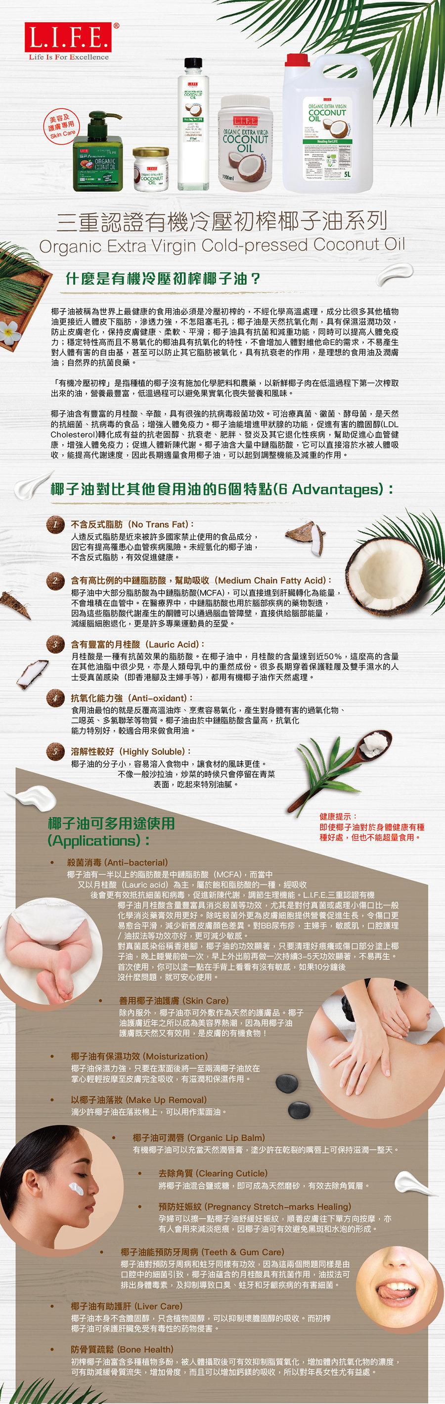 創之杰 L.I.F.E. 為你帶來經美國農業部、歐盟、日本、美國食品藥物管理局及公平貿易認可的斯里蘭卡有機椰子油。從成熟椰子中使用冷壓方式提取的有機食用油,無任何化學物質以及添加劑,可進行高達180 °C的煮食,讓你食得安心又放心。