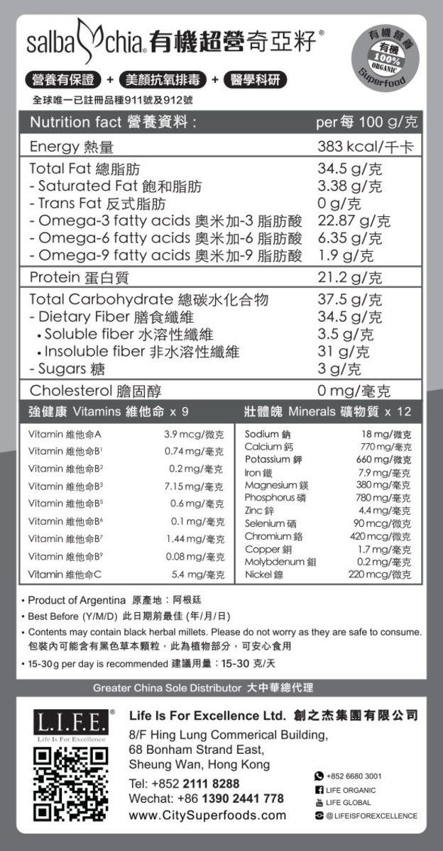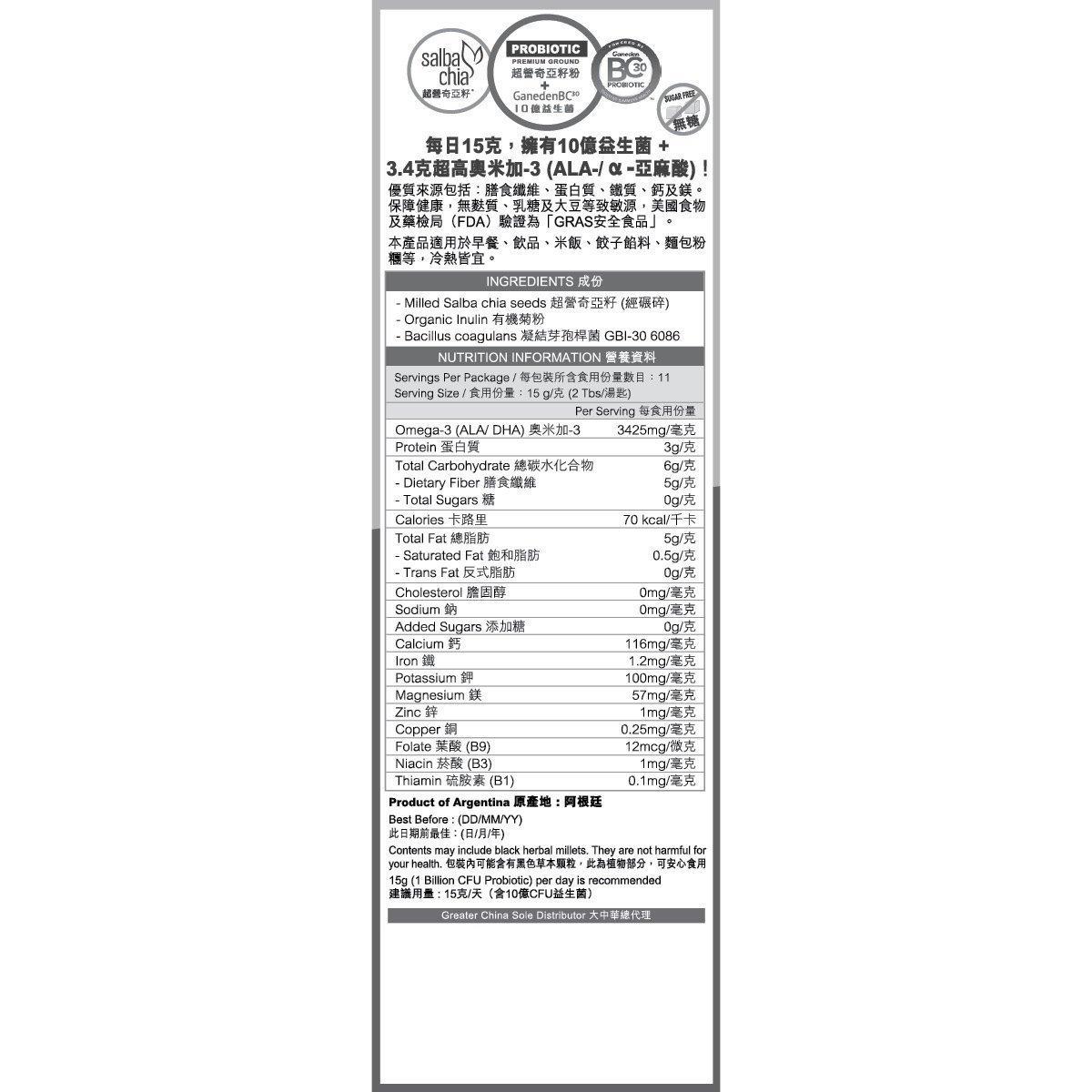 成份: 超營奇亞籽粉 (經碾碎)、有機菊粉、凝結芽孢桿菌BC30