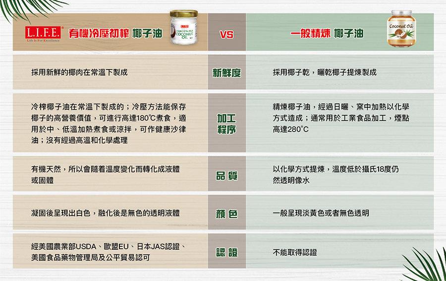 創之杰 L.I.F.E. 為你帶來經美國農業部、歐盟、日本、美國食品藥物管理局及公平貿易認可的斯里蘭卡有機椰子油。從成熟椰子中使用冷壓方式提取的有機食用油,無任何化學物質以及添加劑,可進行高達180 °C的煮食,讓你食得安心又放心。