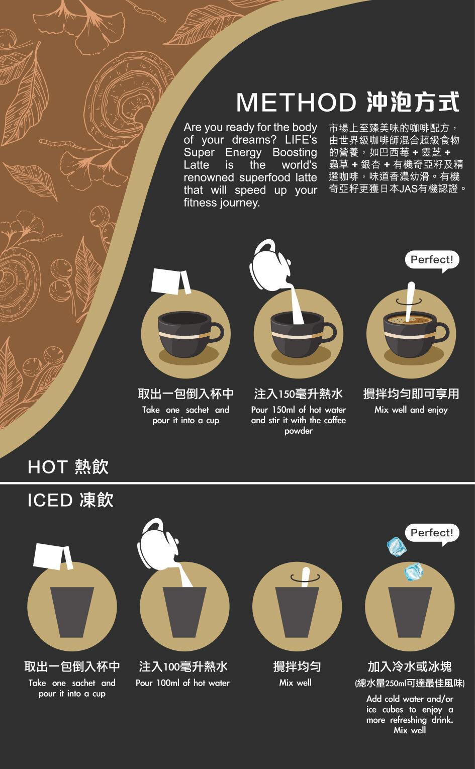 市場上唯一獲得專利配方的咖啡,由世界級咖啡師混合超級食物的營養,如巴西莓 + 靈芝 + 蟲草 + 銀杏 + 有機奇亞籽及精選咖啡,味道香濃幼滑。有機奇亞籽更獲日本JAS,歐盟EU和美國USDA有機認證。