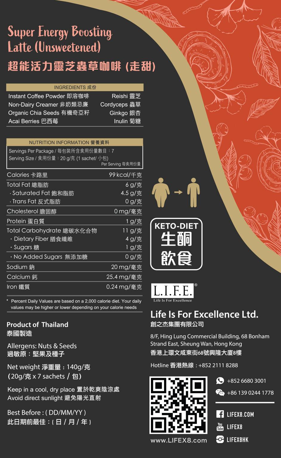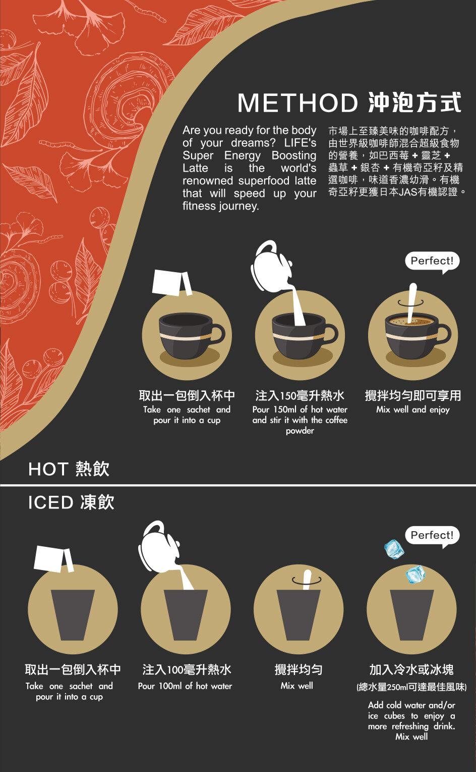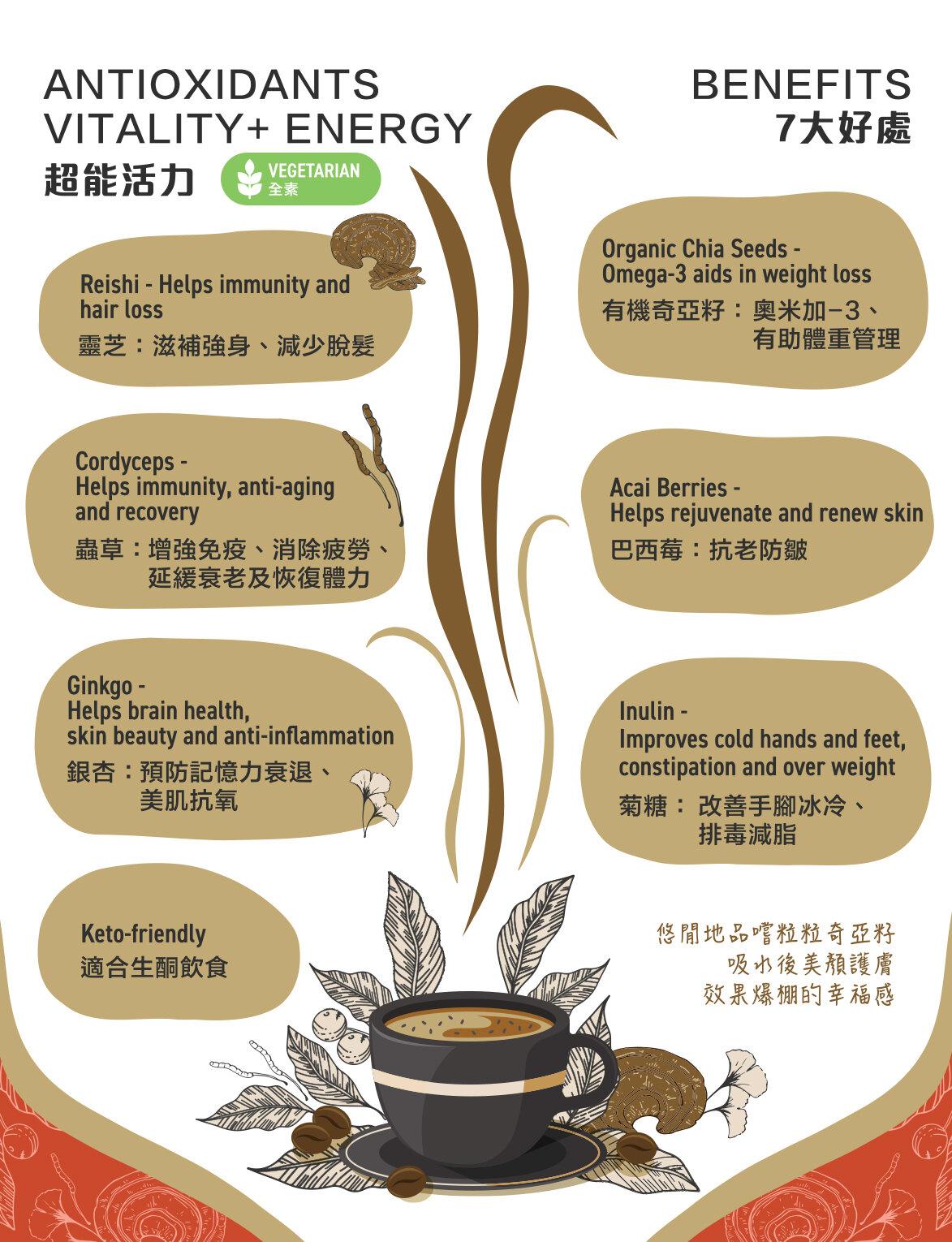 超能活力灵芝虫草咖啡??市场上唯一获得专利配方的咖啡,由世界级咖啡师混合超级食物的营养,如巴西莓 + 灵芝 + 虫草 + 银杏 + 有机奇亚籽及精选咖啡,味道香浓幼滑。有机奇亚籽更获日本JAS,欧盟EU和美国USDA有机认证。??好处?灵芝 - 滋补强身、减少脱发?虫草 - 增强免疫、消除疲劳、延缓衰老及恢復体力?银杏 - 预防记忆力衰退、美肌抗氧?有几奇亚籽 - 奥米加-3、有助体重管理?巴西莓 - 抗老防皱?菊糖 - 改善手脚冰冷、排毒减脂??「悠闲地品嚐粒粒奇亚籽吸水后美颜护肤效果爆棚的幸福感~」?-??冲泡方式?热饮 -?1. 取出一包倒入杯中?2. 注入150毫升热水?3. 搅拌均匀即可享用??冻饮 -?1. 取出一包倒入杯中?2. 注入100毫升热水?3. 搅拌均匀?4. 加入冷水或冰块