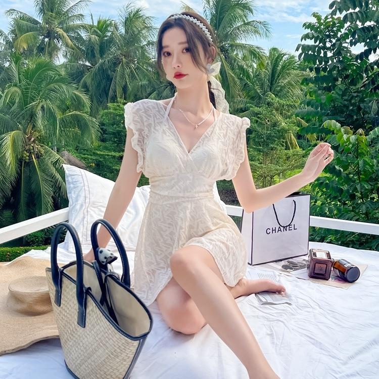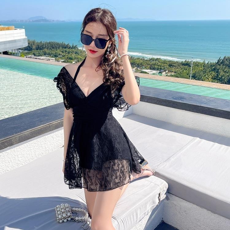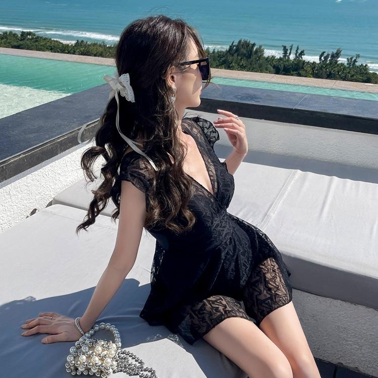 蕾絲純色連體泳衣