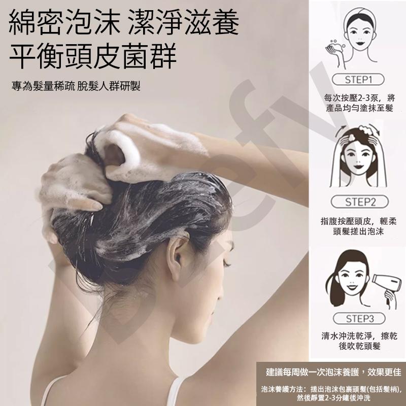 - 綿密泡沫,潔淨滋養- 平衡頭皮菌群- 專為髮量稀疏,脫髮人群研製每次按壓2-3泵,將產品均勻塗抹至髮絲指腹按壓頭皮,輕柔頭髮搓出泡沫清水沖洗乾淨,擦乾後吹乾頭髮建議每周做一次泡沫養護,效果更佳泡沫養護方法:搓出泡沫包裹頭髮(包括髮梢),然後靜置2-3分鐘後沖洗