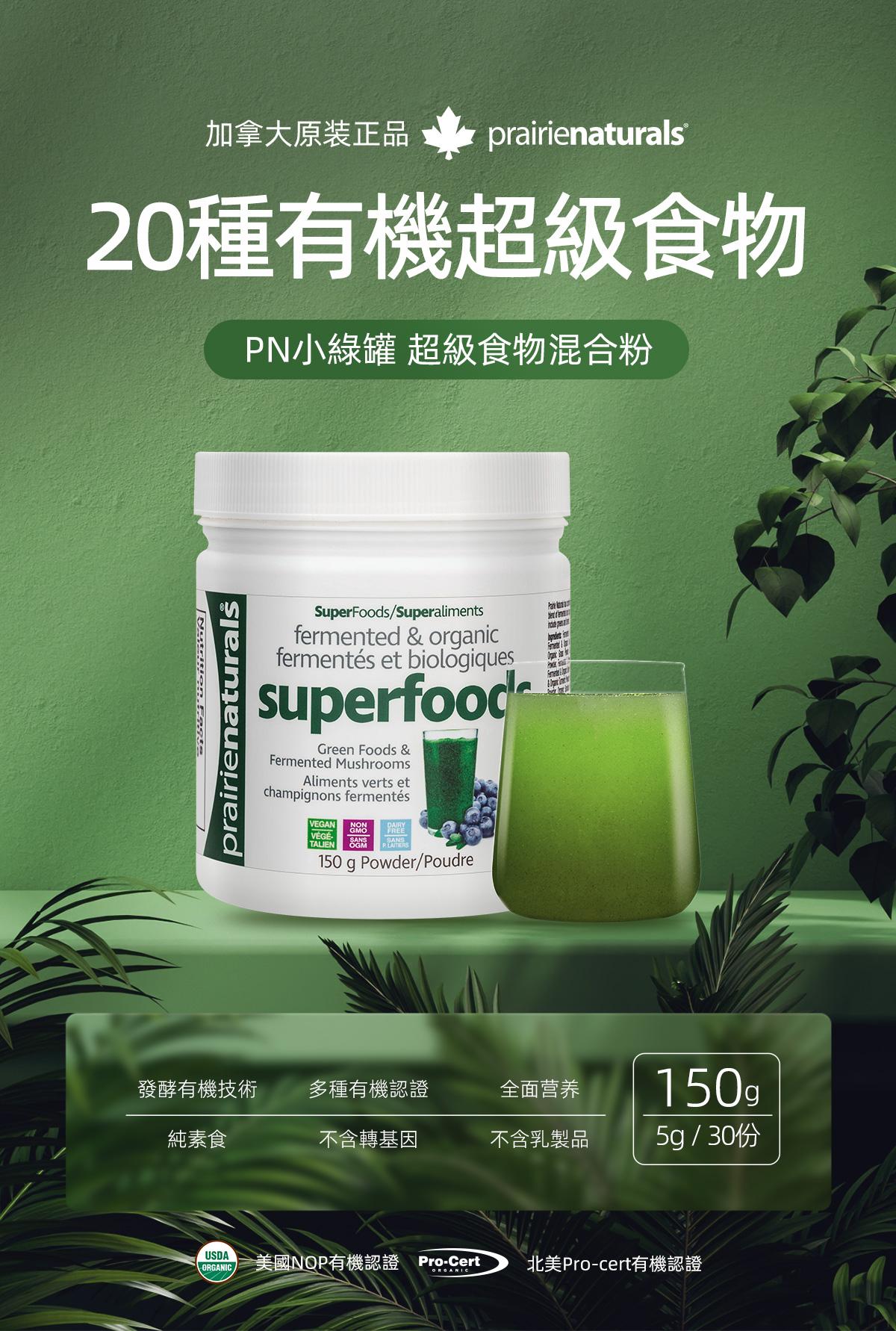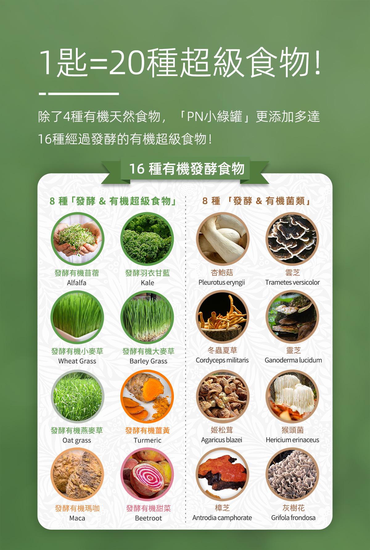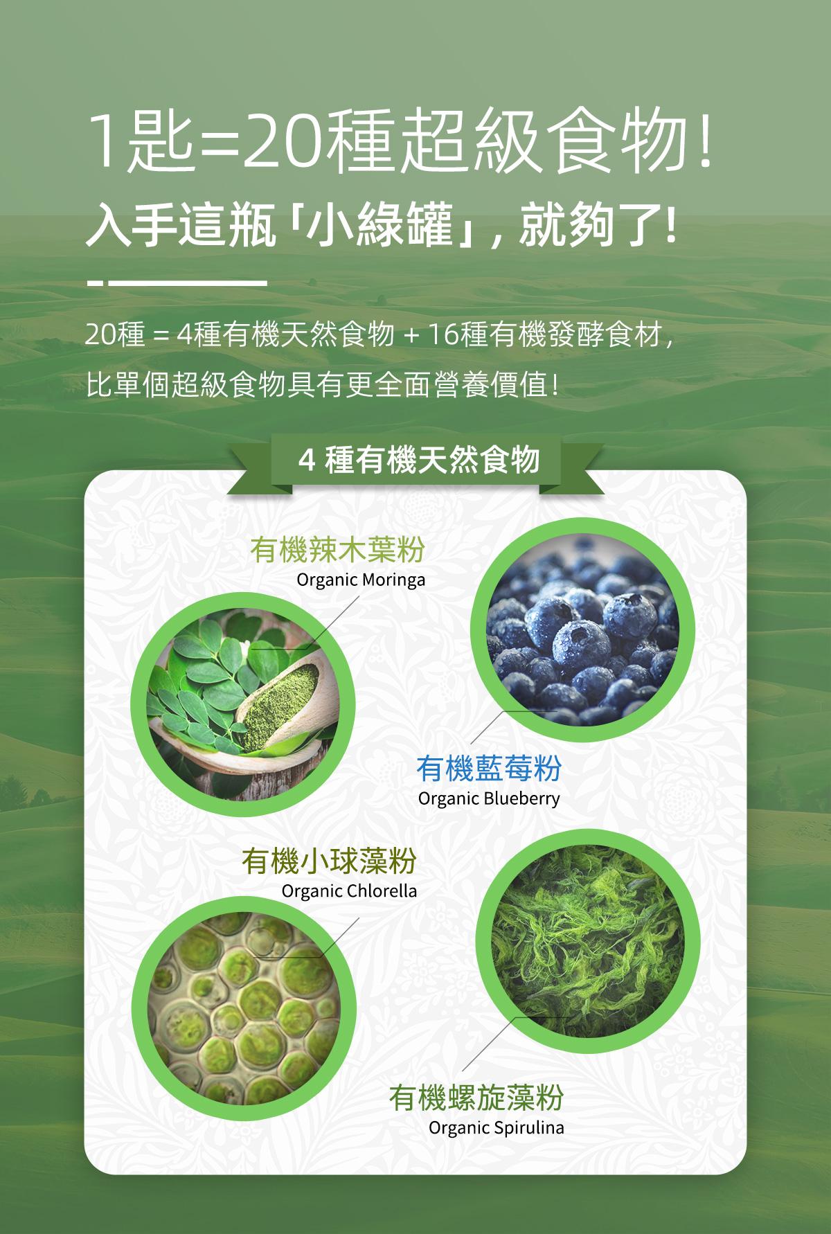 USDA有機認證,相對市面聲稱有機食品質量及營養更有保證。 蘊含20種有機超級食物 羽衣甘藍、紫花苜蓿、辣木葉、大麥草、小麥草、燕麥草、小球藻、螺旋藻、瑪卡、薑黃、藍莓、紅菜頭、冬蟲夏草、靈芝、雲芝、牛樟芝、姬松茸、灰樹花、杏鮑菇、猴頭菇。 • 提高身體鹼性,增強免疫能力 • 保護腸道健康,排毒纖體瘦身 • 促進皮膚細胞修復,緊緻肌膚 • 清除自由基,調節體質抗衰老 • 改善三高問題,預防骨質疏鬆 • 有機發酵技術,更易人體吸收