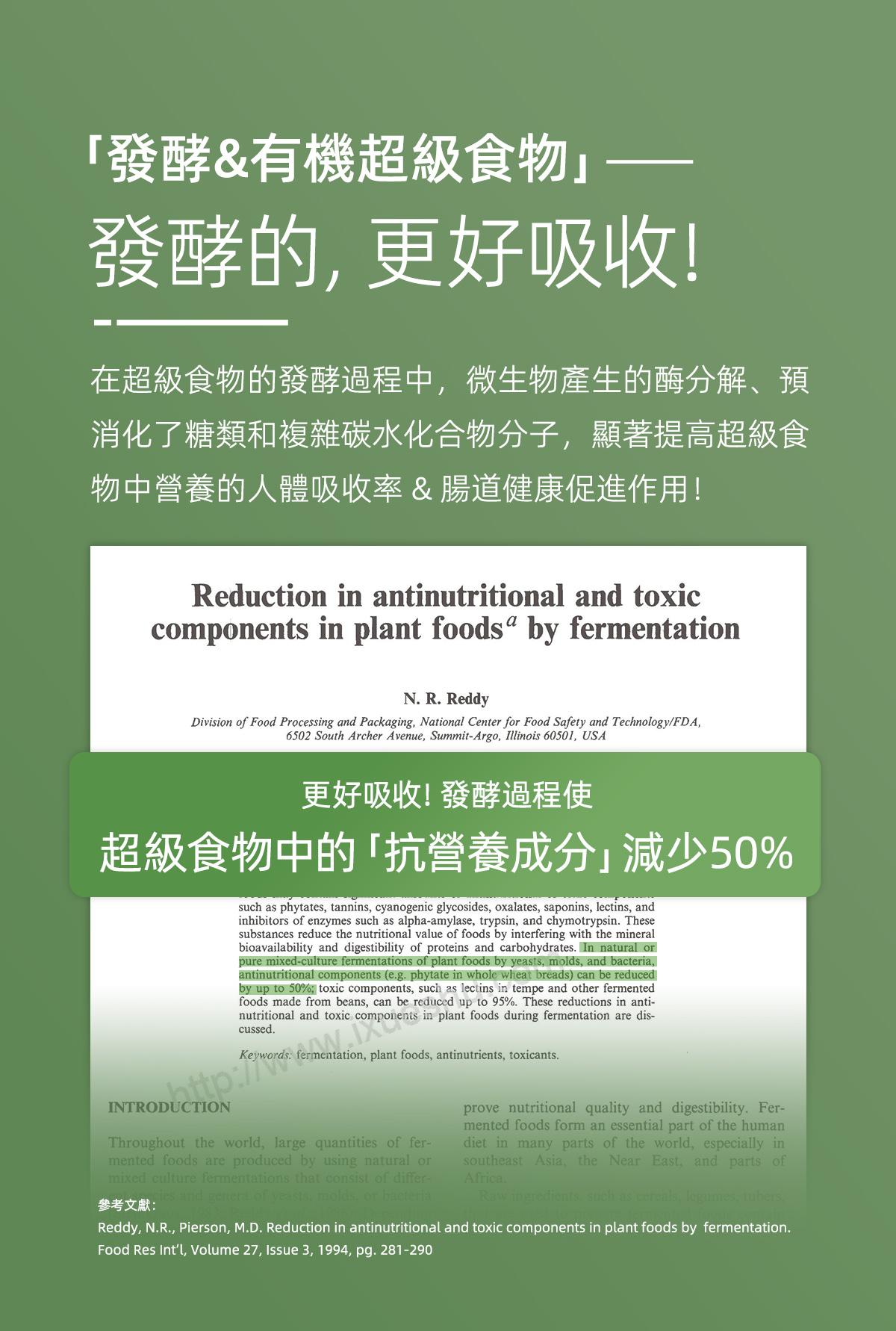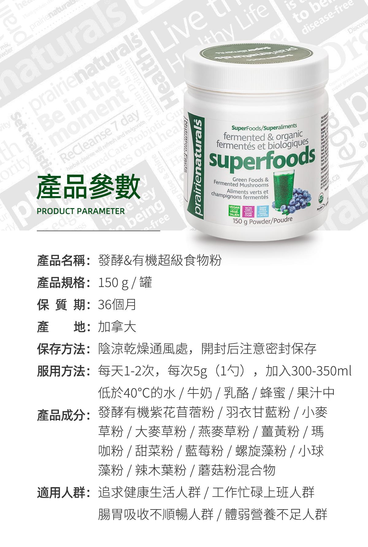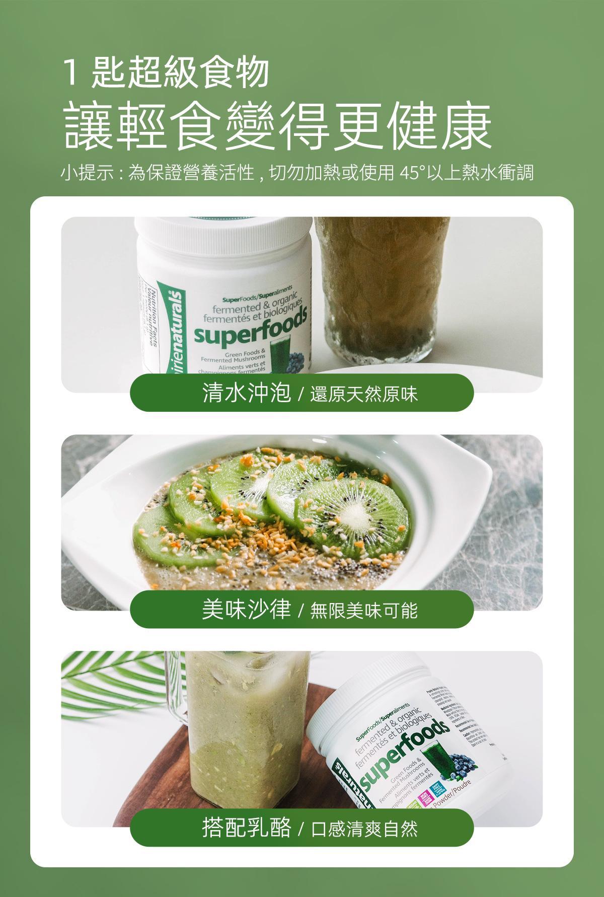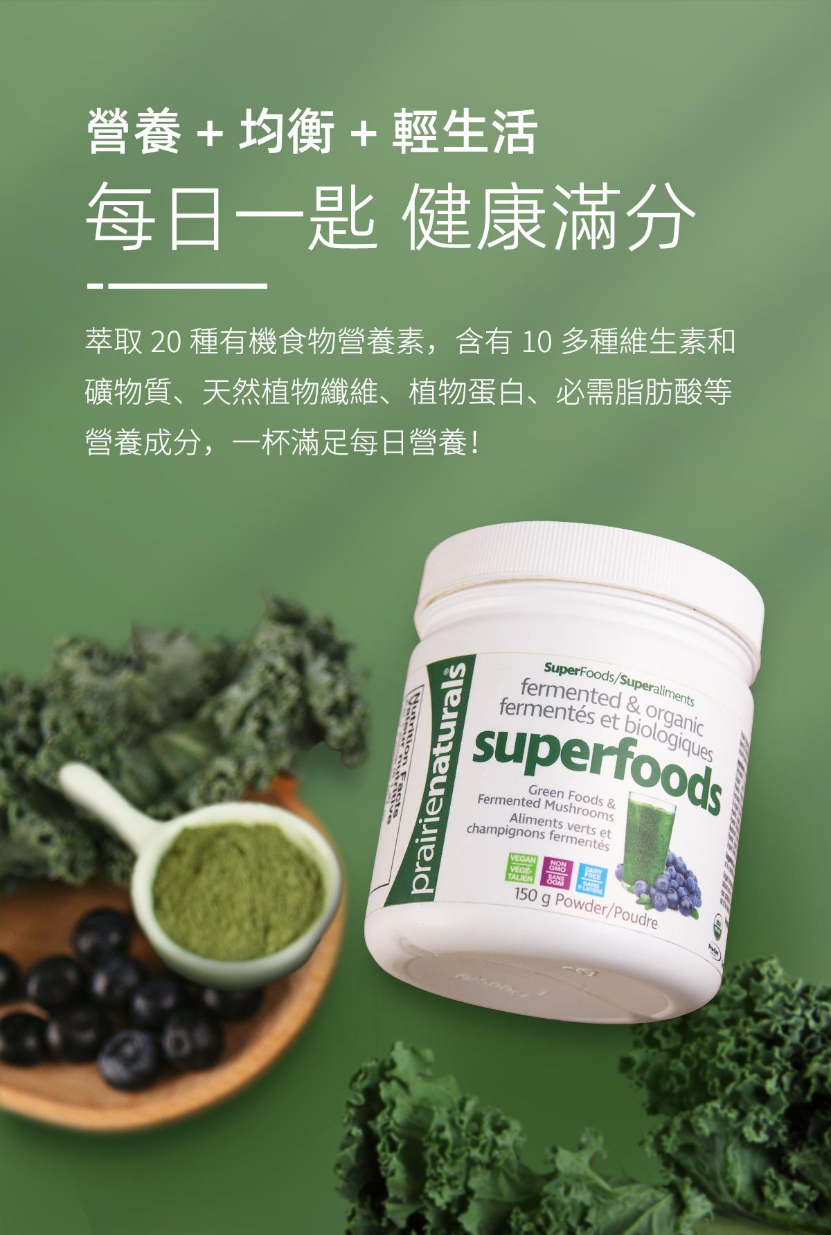 USDA有機認證,相對市面聲稱有機食品質量及營養更有保證。 蘊含20種有機超級食物 羽衣甘藍、紫花苜蓿、辣木葉、大麥草、小麥草、燕麥草、小球藻、螺旋藻、瑪卡、薑黃、藍莓、紅菜頭、冬蟲夏草、靈芝、雲芝、牛樟芝、姬松茸、灰樹花、杏鮑菇、猴頭菇。 • 提高身體鹼性,增強免疫能力 • 保護腸道健康,排毒纖體瘦身 • 促進皮膚細胞修復,緊緻肌膚 • 清除自由基,調節體質抗衰老 • 改善三高問題,預防骨質疏鬆 • 有機發酵技術,更易人體吸收