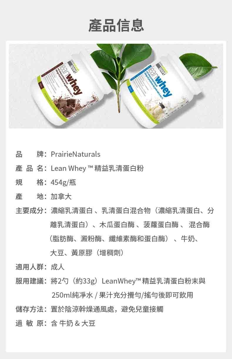 易於消化的蛋白質粉可促進燃燒脂肪並增加瘦肌肉質量。 Lean Whey™ 是純、微超過濾、低溫加工的優質乳清蛋白 專有混合物,不含糖和低脂及超低熱量 比雞蛋、奶酪和肉類更高的蛋白質和更少的脂肪 易於消化和吸收良好的蛋白質來源,富含蛋白質消化酶 有效的飽腹感和代謝調節劑 純天然香料製成,不含糖、麩質、人造香料或色素