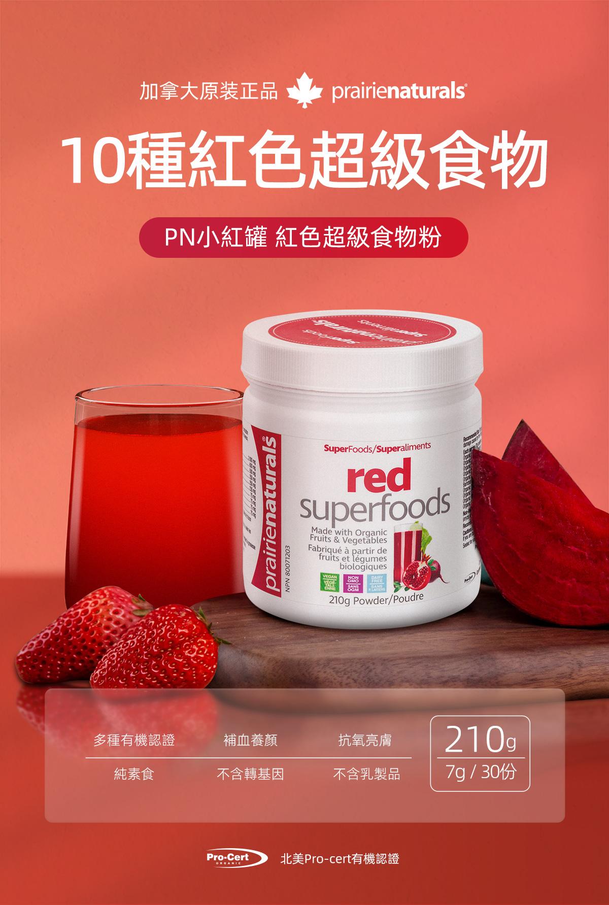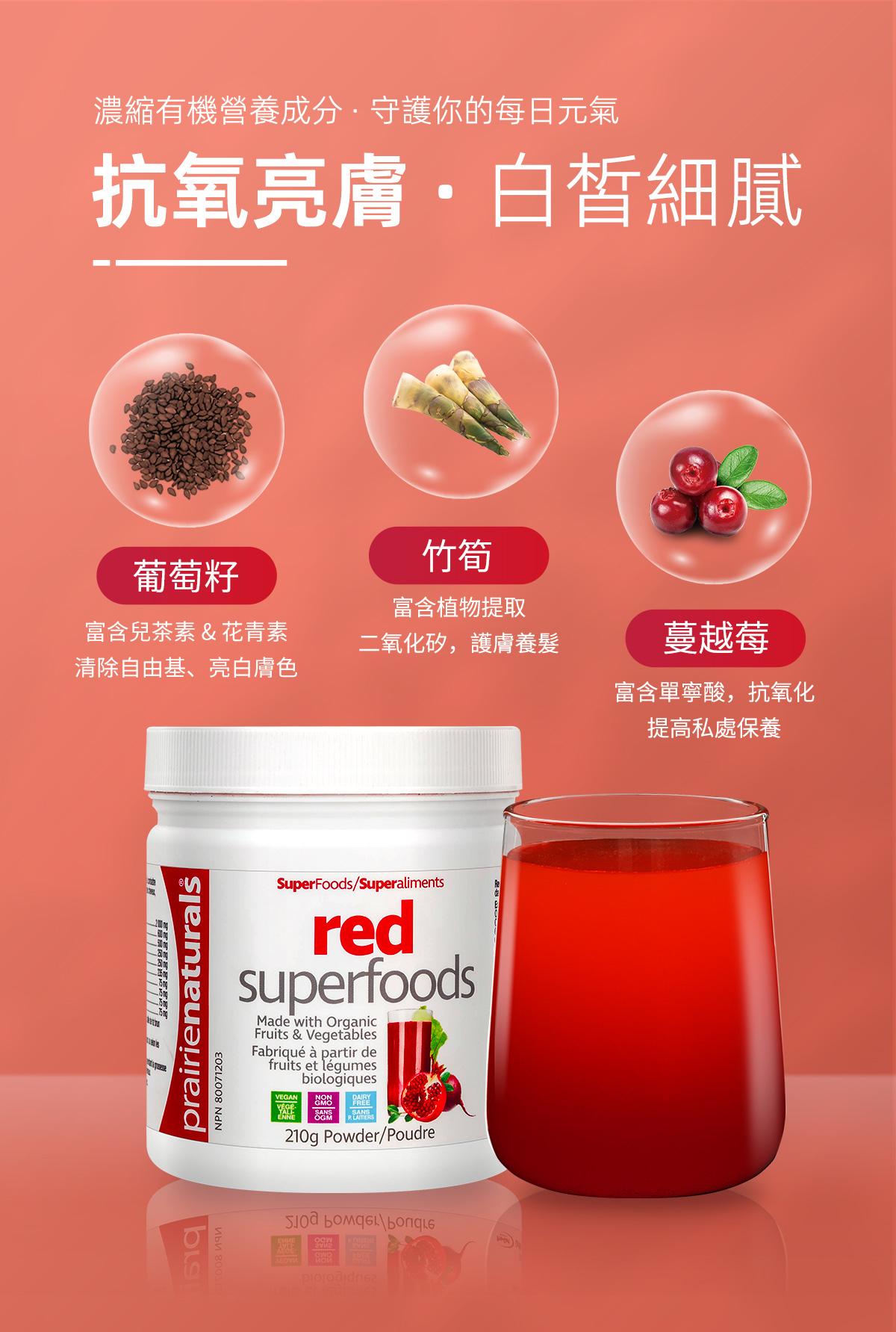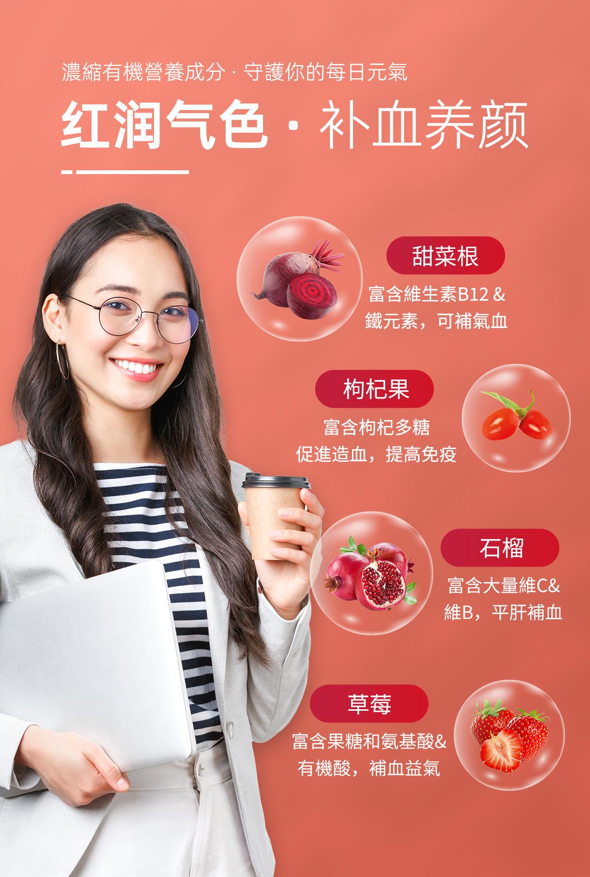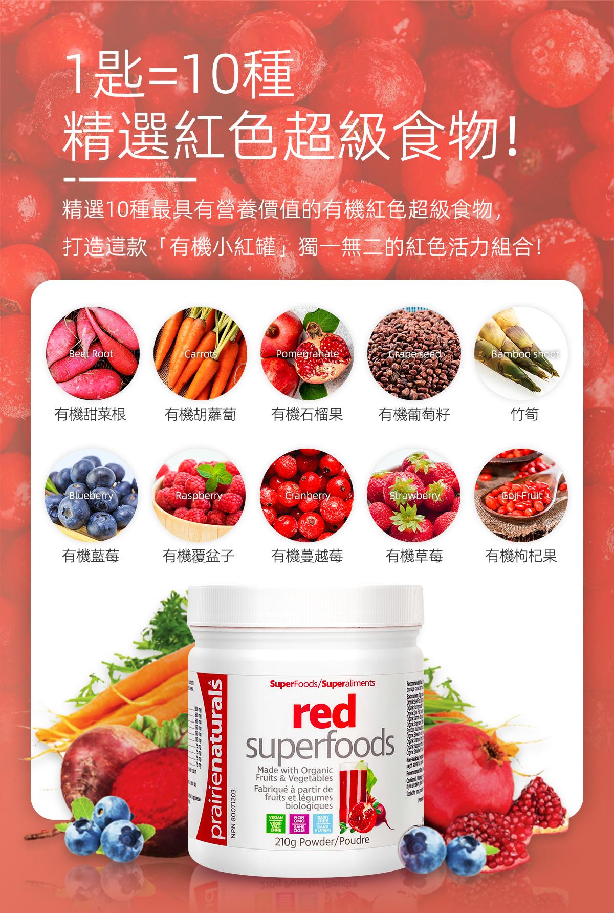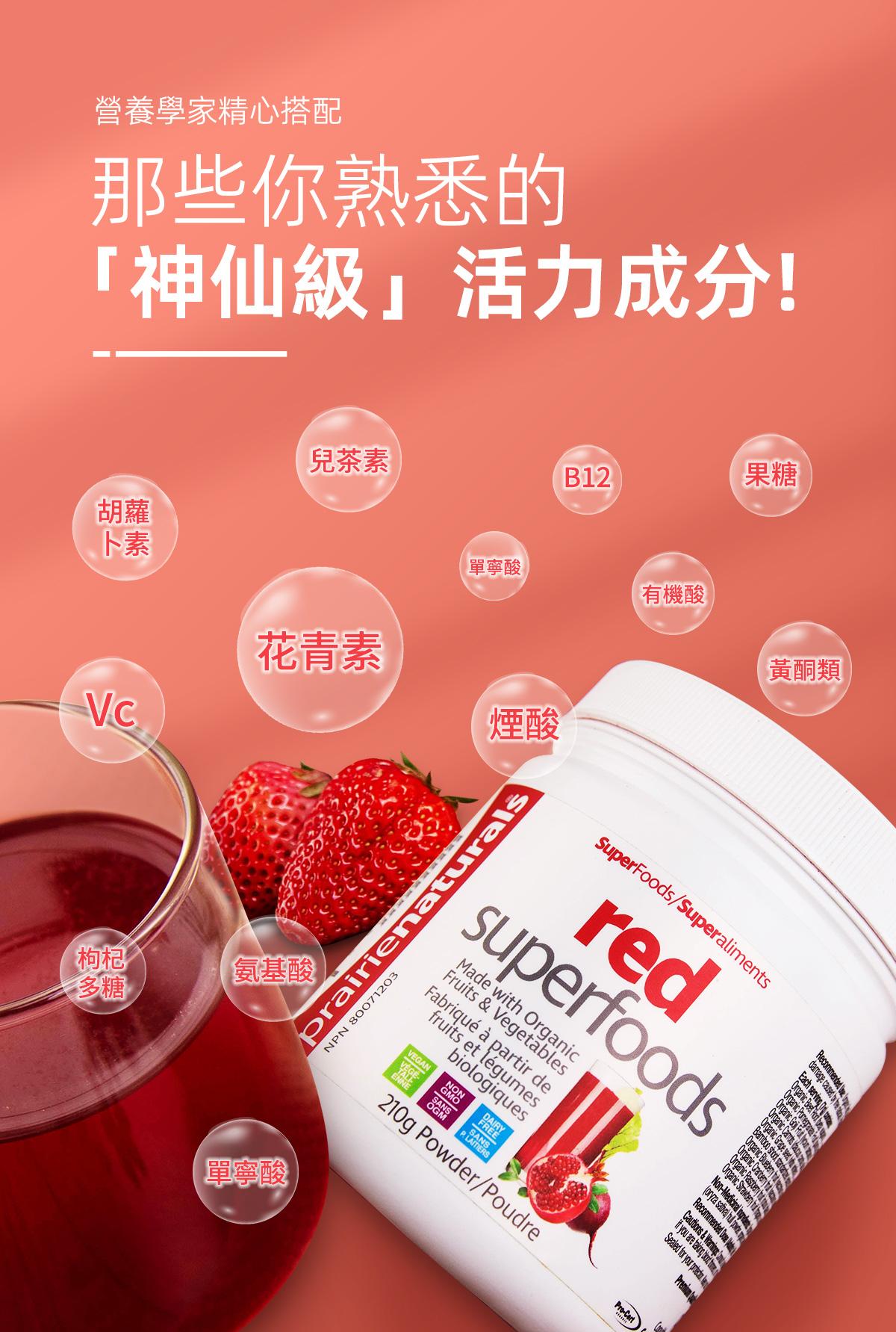 有機紅色超級食物,蘊含10種有機超級食物 紅菜頭、紅石榴、葡萄籽、胡蘿蔔、佛肚竹、杞子、覆盆子、藍莓、蔓越莓、士多啤梨。 • 美顏潤肌,保持肌膚水氧彈性 • 促進血液循環,改善暗啞膚色 • 修護髮質及美甲,亮麗有光澤 • 保護眼睛視力,告別乾澀疲勞 • 超級抗氧成分,延緩衰老表現 • 提升免疫力,預防私處受感染