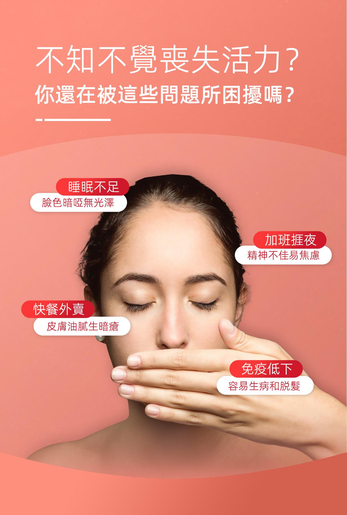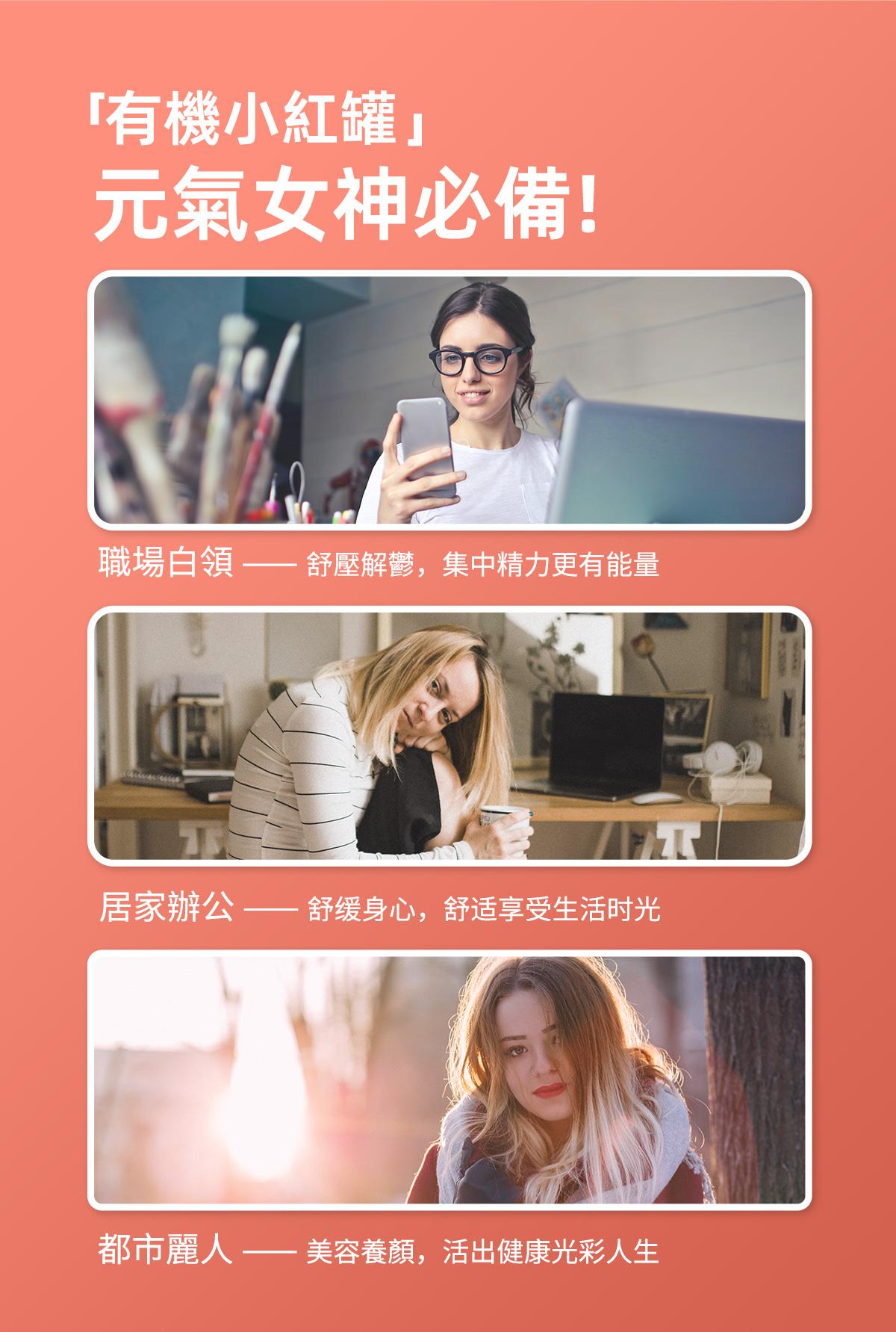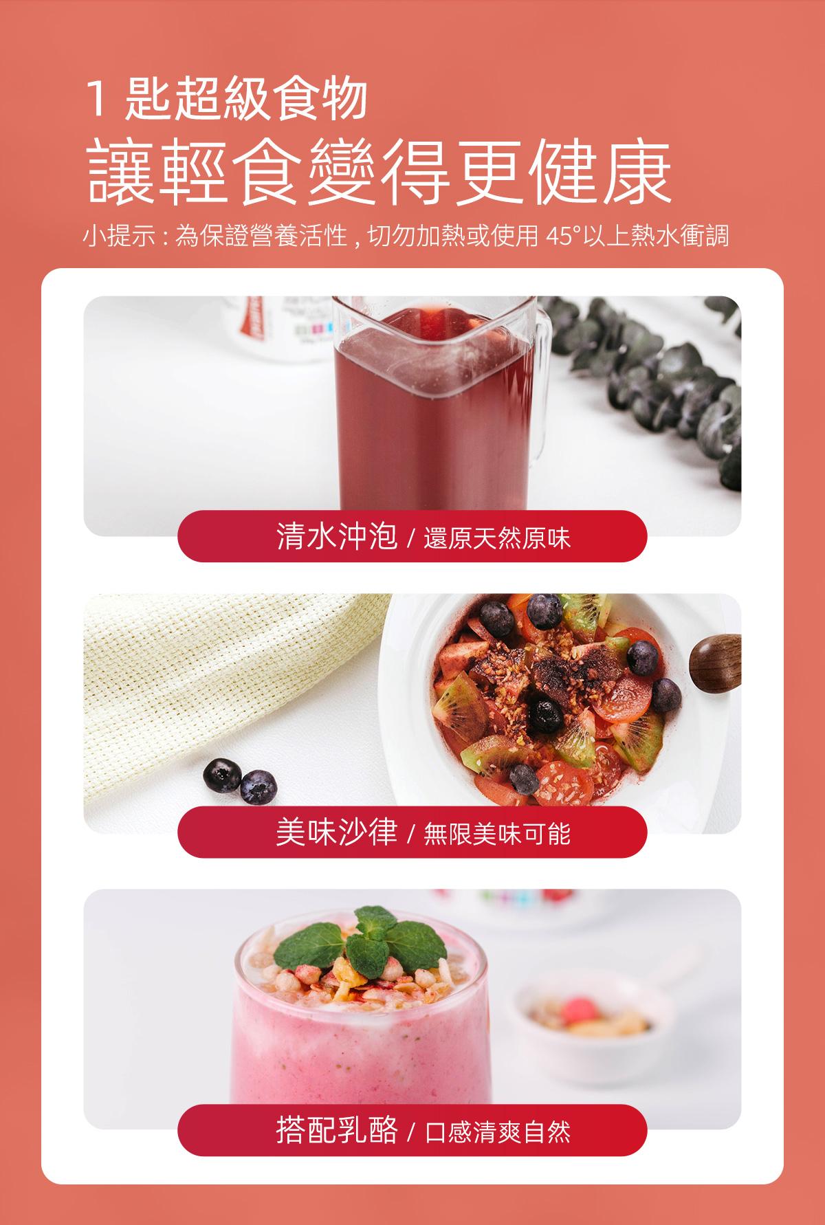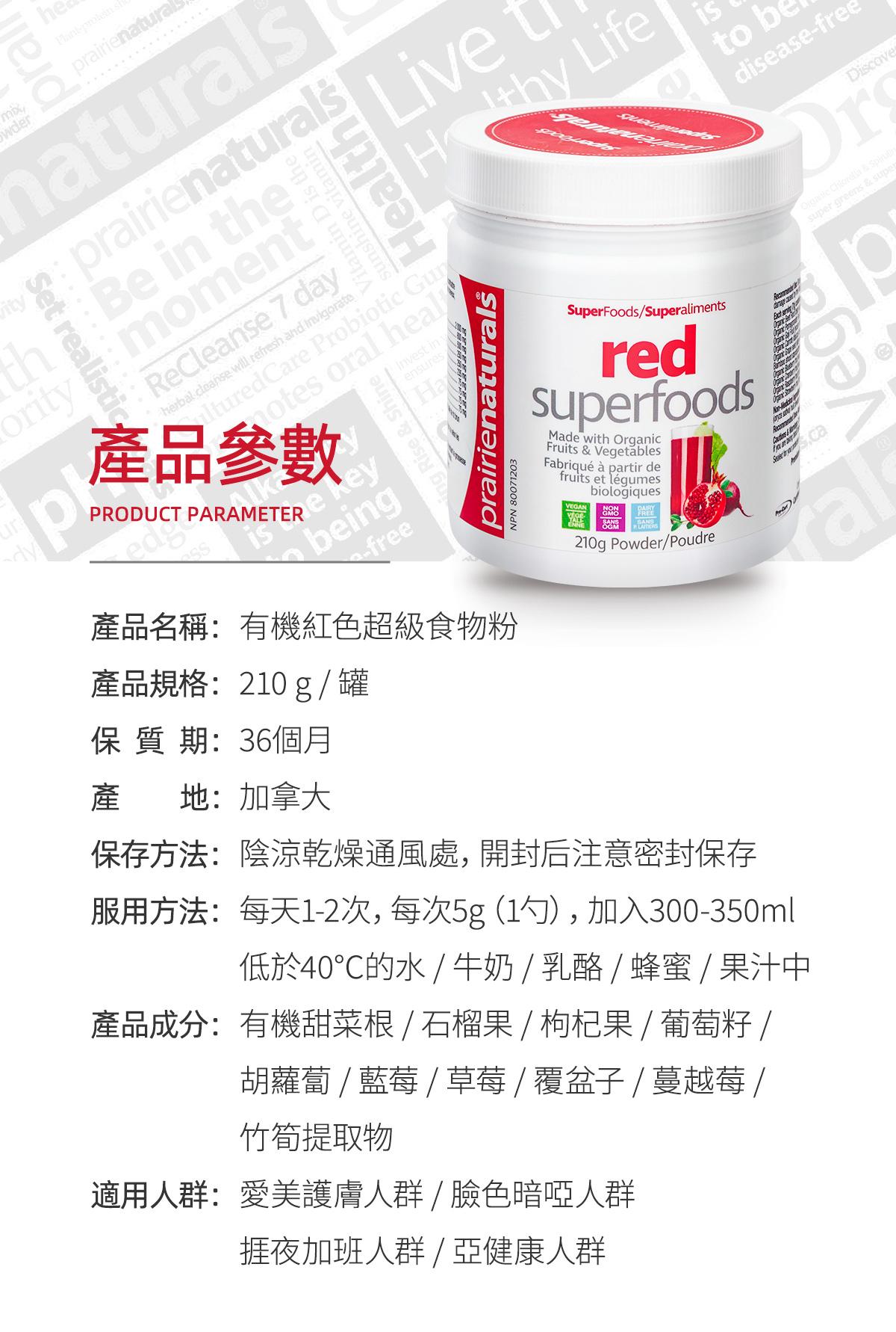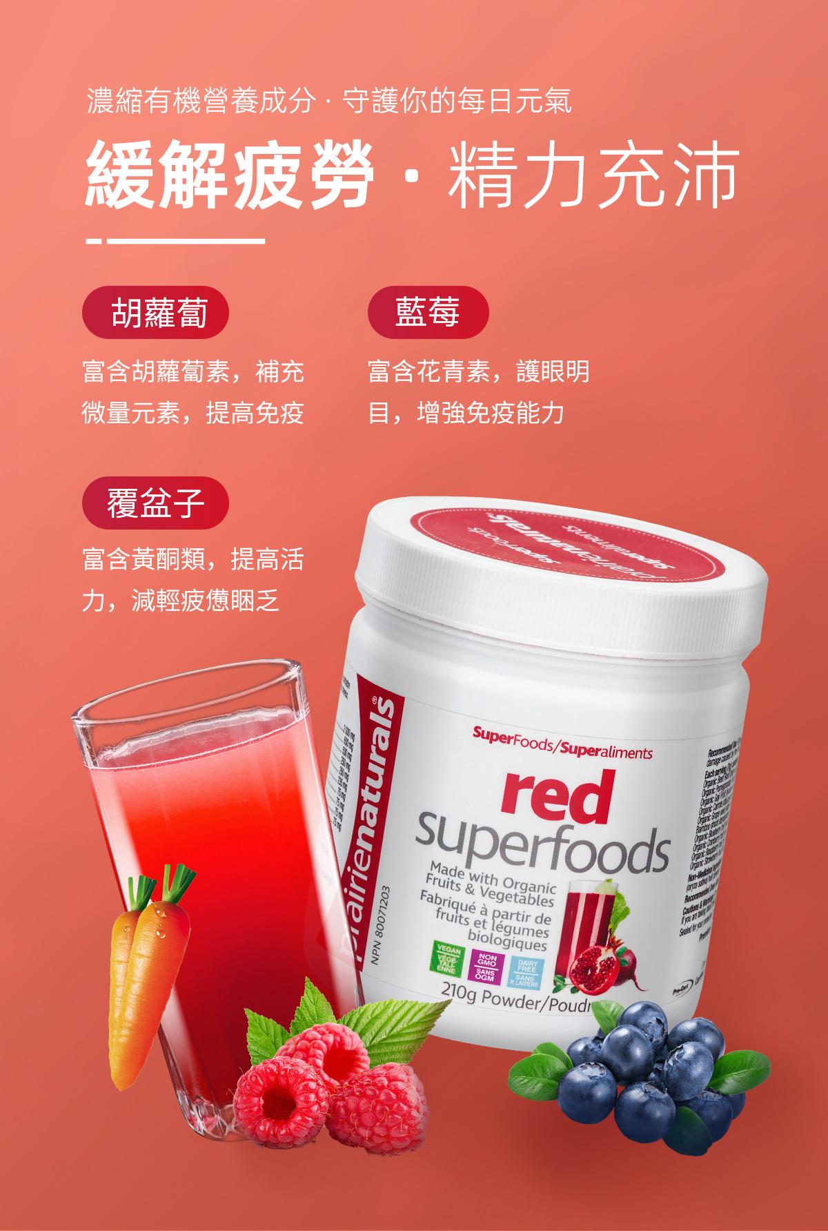 有機紅色超級食物,蘊含10種有機超級食物 紅菜頭、紅石榴、葡萄籽、胡蘿蔔、佛肚竹、杞子、覆盆子、藍莓、蔓越莓、士多啤梨。 • 美顏潤肌,保持肌膚水氧彈性 • 促進血液循環,改善暗啞膚色 • 修護髮質及美甲,亮麗有光澤 • 保護眼睛視力,告別乾澀疲勞 • 超級抗氧成分,延緩衰老表現 • 提升免疫力,預防私處受感染