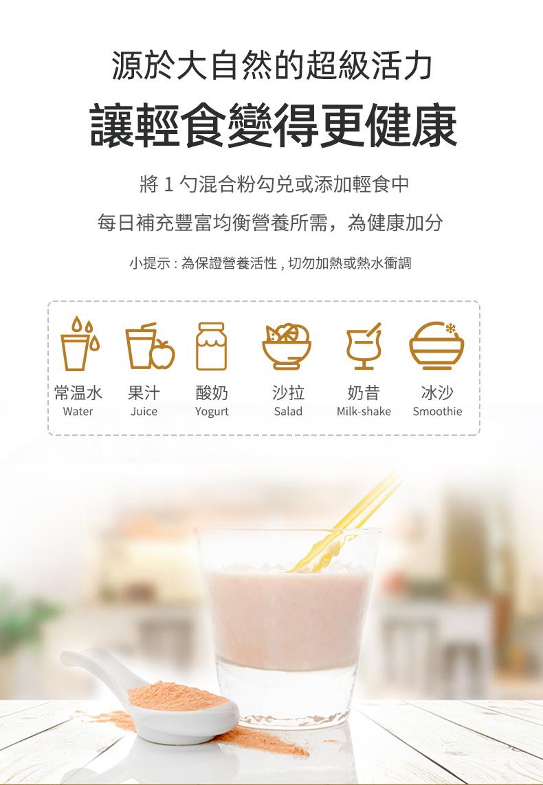 含55種豐富活力營養素、20種氨基酸等多種成分 增強免疫力和抗疲勞 強化新陳代謝、加強身體循環 可減輕都市人常有的壓力感 緩解更年期症狀