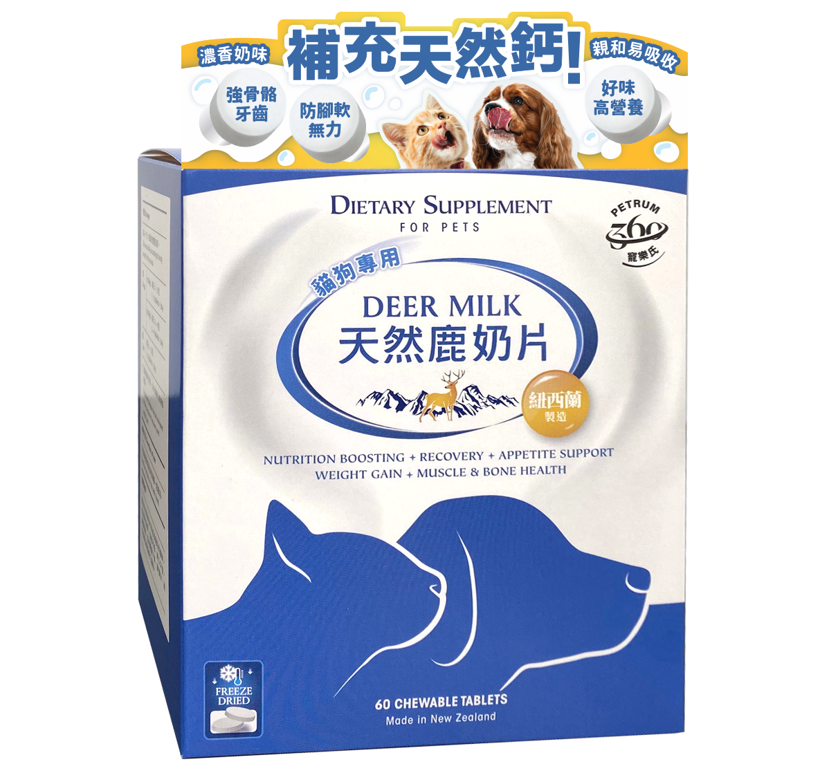 天然鹿奶 含原生鹿奶鈣,更親和易吸收 增加骨質密度,重建肌肉,強化體魄 奶味濃郁,改善偏食無胃口