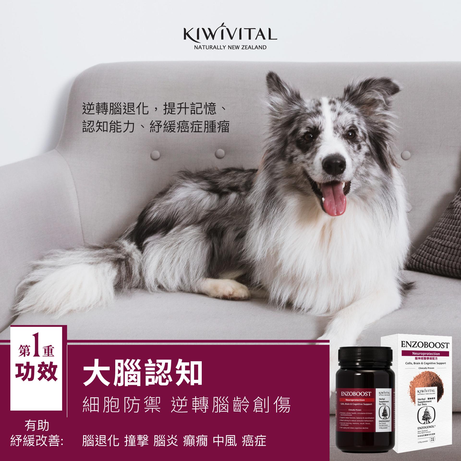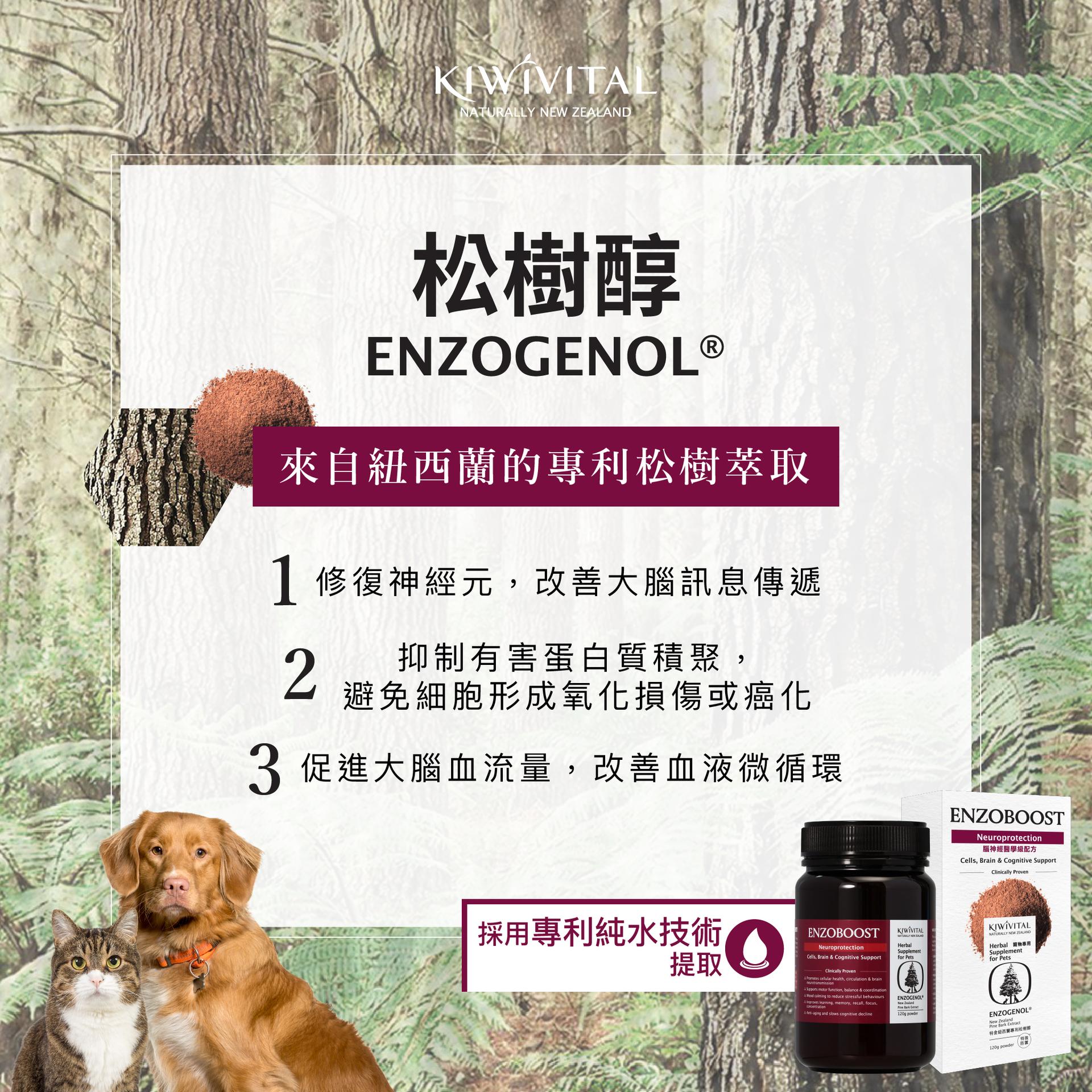 寵物腦神經受損,影響協調及活動力 EnzoBoost 腦神經醫學級配方,特含專利「Enzogenol®松樹醇」 ,產品採用紐西蘭火山士域野生生長的松樹皮,配合專利純水技術萃取。有效修復神經元、細胞防禦、及促進血液微循環,重建「腦·脊·肌」訊息傳遞。 臨床證明3重功效 : 第1重功效: 大腦認知 -- 細胞防禦,逆轉腦齡創傷 超微細分子,有效穿透血腦屏障直達腦部,激活腦細胞,修復漸進式的腦部及記憶衰退。配方更有效改善大腦血流量,抑制有害蛋白及腦部氧化。透過修復大腦神經訊息傳遞,針對預防改善因腦部受損引起的疾病, 包括:腦退化、癲癇抽搐、中風、腦癌、腦積水、腦腫脹、腦炎創傷、撞擊等。 第2重功效: 神經前庭 -- 守護神經元,重建協調平衡 幫助修復受損神經元,促進神經再生,紓緩椎間盤退化及前庭反覆復發症狀,提升寵物的協調及平衡能力,舒緩神經痛症。預防多種神經系統失靈問題,包括:四肢癱瘓、肌肉無力、不能站立、單邊傾側、頭暈耳嗚及五感失靈等問題。 第3重功效: 情緒行為 -- 速效鎮靜,長效穩定改善失控異常 草療鎮靜,紓緩壓力及放鬆大腦神經。改善外來環境因素改變而引起的過分焦慮、壓力、緊張情緒。透過調節腦部訊息之間的互動及交互,長效改善過度活躍及興奮行為,幫助寵物大腦回復平靜狀態。 天然草療配方,結合多種活性成份,包括藻油DHA,L-Theanine茶胺酸及維他命B雜,協同效應鞏固腦神經系統。 無睡意,不含藥性,適合貓狗服用。 成分 松樹醇(紐西蘭松樹皮提取)/75mg、藻油DHA/500mg、茶氨酸/50 mg 、維他命B6/15mg、維他命B1/10 mg 、維他命C/13mg、維他命B3/15 mg、 維他命E/25IU、亞麻籽粉、酵母 餵食指南(服用劑量) 每日一次,按貓狗體重混合乾/濕糧餵服 (如已出現症状的貓狗,可將建議劑量提升) 犬用 20kg 3匙(7.5g) 貓用 標準 1匙(2.5g) 儲存方法:室溫及避免陽光直射,開封後3個月内使用完