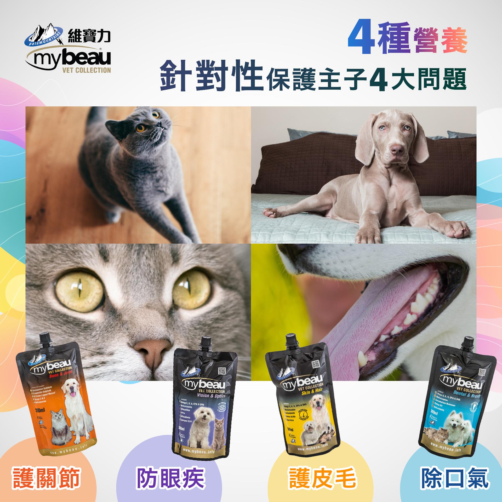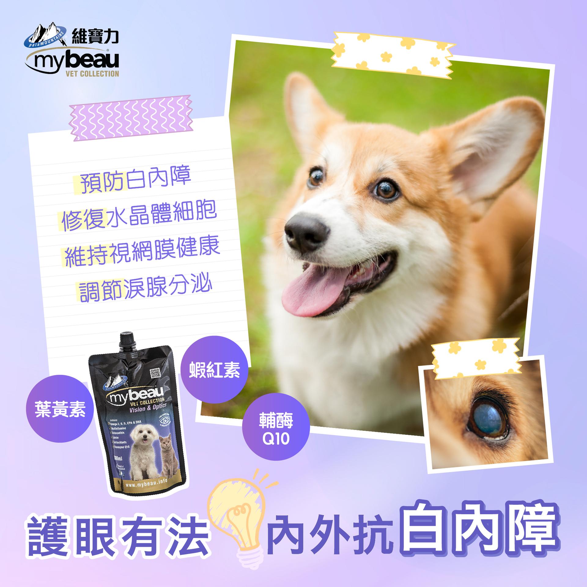 Mybeau維寶力紐西蘭保健啫哩Vision&Optics視力護眼配方含有葉黃素,蝦紅素蝦青素,輔酶Q10,針對眼睛全面保護(包括昌體,視網膜,視覺神經)。預防或改善多種眼疾,例如 乾眼,白內障,年齡增長而出現的視力退化,青光眼等。 專利液態配方被世界各地獸醫一至推崇為業內複合營養首選的原因。它能提供每日均衡營養所需,劑量恰到好處,結合99%吸收率,提升65%免疫保護,有助提升抵抗力,預防疾病。此外,體內的抗氧化指數更可增強50%,有助對抗自由基。 當貓犬踏入年老階段,針對眼睛的營養素會逐漸流失,增加視網膜退化,白內障及黃斑病變等眼疾風險,Vision&Optics護眼配方含豐富的胡蘿蔔素(如:葉黃素Lutein,蝦青素Astaxanthin),有助預防自由基及外來光線對眼睛視網膜帶來的影響及減低黃斑病變危機,保護視網膜及減慢退化;其獨特配方更含 - 輔酶Q10-Coenzyme Q10,增強免疫能力,預防心血管疾病,有著強效的抗氧化功能,減低傷害,強化眼睛 - 奧米加脂肪酸、維他命C&E,除抗氧化外,有助促進正常淚水分泌及鞏固視網膜結構。 - 液態更有效透過血管充份吸收,輸送到眼部 - 紐西蘭三文魚油含豐富奧米加脂肪酸3&6,鞏固免疫系統,增強心臟健康,毛髮健康亮麗 - 100%紐西蘭製造,選取優質原材料 - MyBeau多種維他命及礦物質補充劑 主要功效 - 幫助滋潤眼球,紓緩眼乾、眼澀和炎症問題 - 平衡淚水分泌,改善淚痕 - 預防視力退化,紓緩眼疾如白內障、青光眼及視網膜退化等常見眼疾 產品特點 - 護眼組合葉黃素、蝦紅素及Q10,針對眼睛全面保護 - 內含蝦紅素,抗氧能力是藍莓的700倍 - 專利啫喱質地,經紐西蘭梅西大學科研,臨床實證吸收率高達99.5%,相比粉狀或丸劑高出10倍 - 肉汁口味,適口性高,容易餵飼,適合任何年齡狗貓 餵食指引 使用前請先搖晃;開封後需冷藏。 每日餵食能達至最佳效果。 根據貓狗體重,按包裝上指示份量服用,可混合乾濕糧一起餵飼。 犬隻:適合任何年齡,每日餵食 迷你犬(5kg以下)......每日5亳升(1茶匙) 小型犬(5kg-9kg)......每日8亳升(1-1/2茶匙)中型犬(10kg-19kg)......每日12亳升(2茶匙)大型犬(20kg以上)......每日15亳升(3茶匙) 貓隻:適合任何年齡,隔日或每星期3次......每次3亳升
