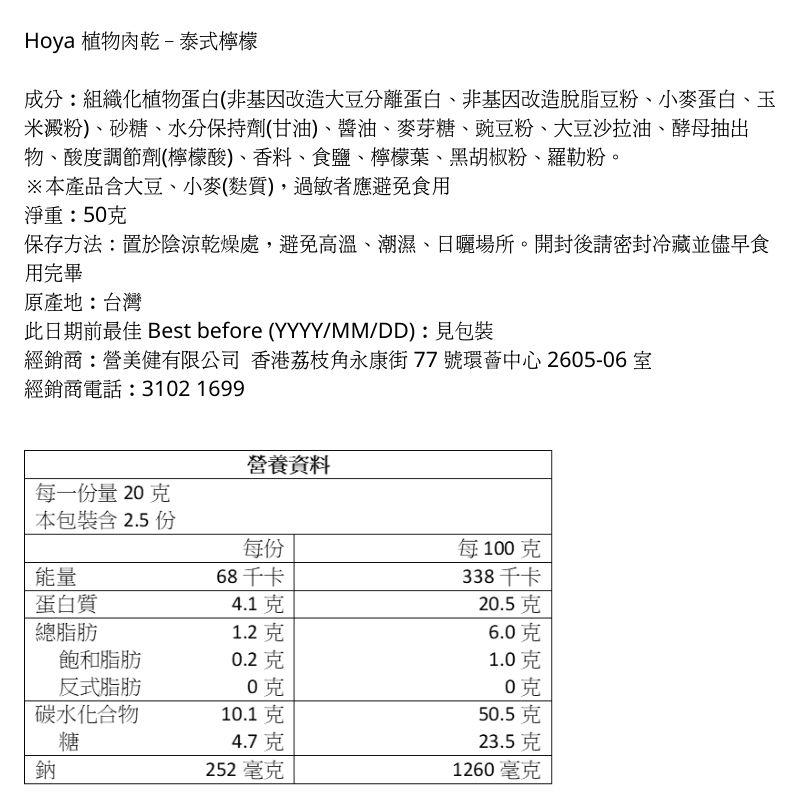 HOYA 植物肉干 - 泰式柠檬口味 (50g)
