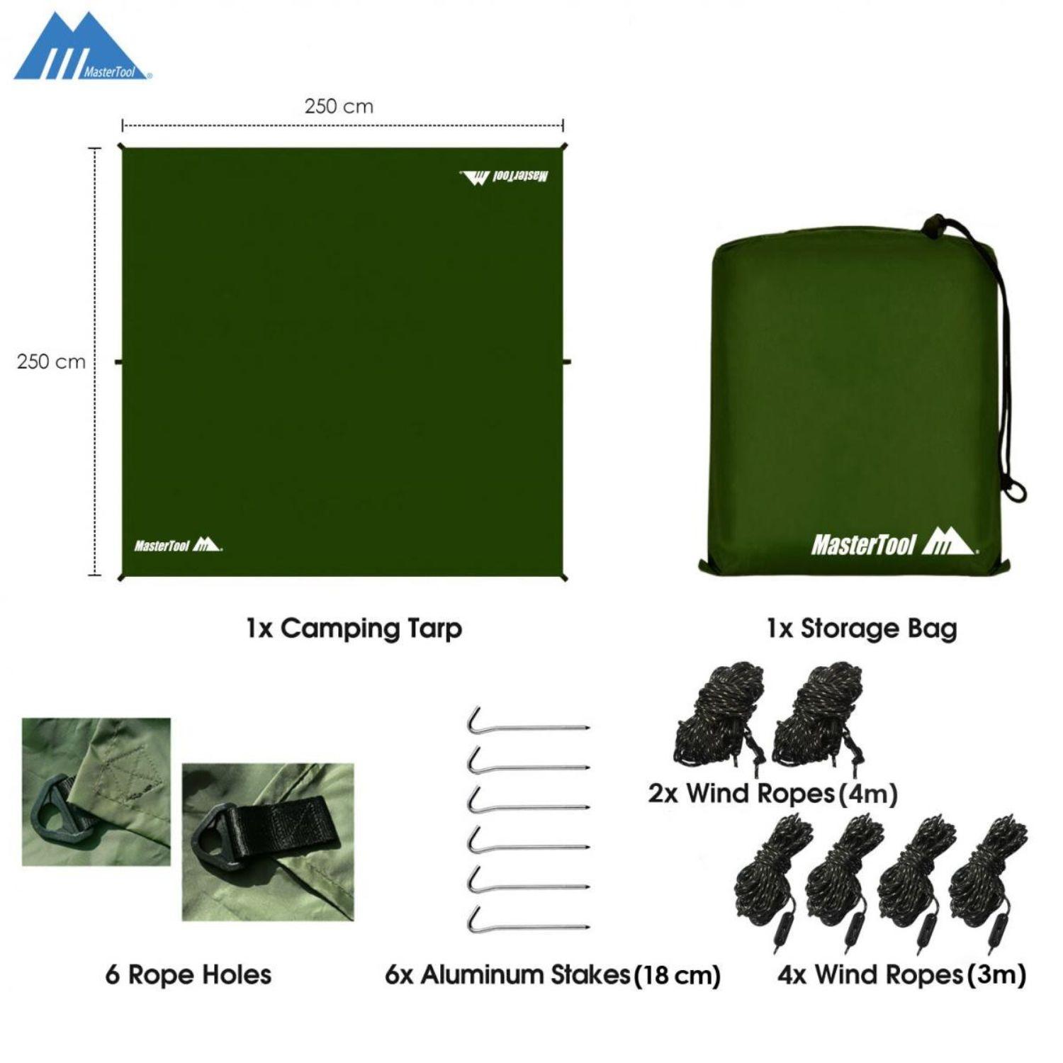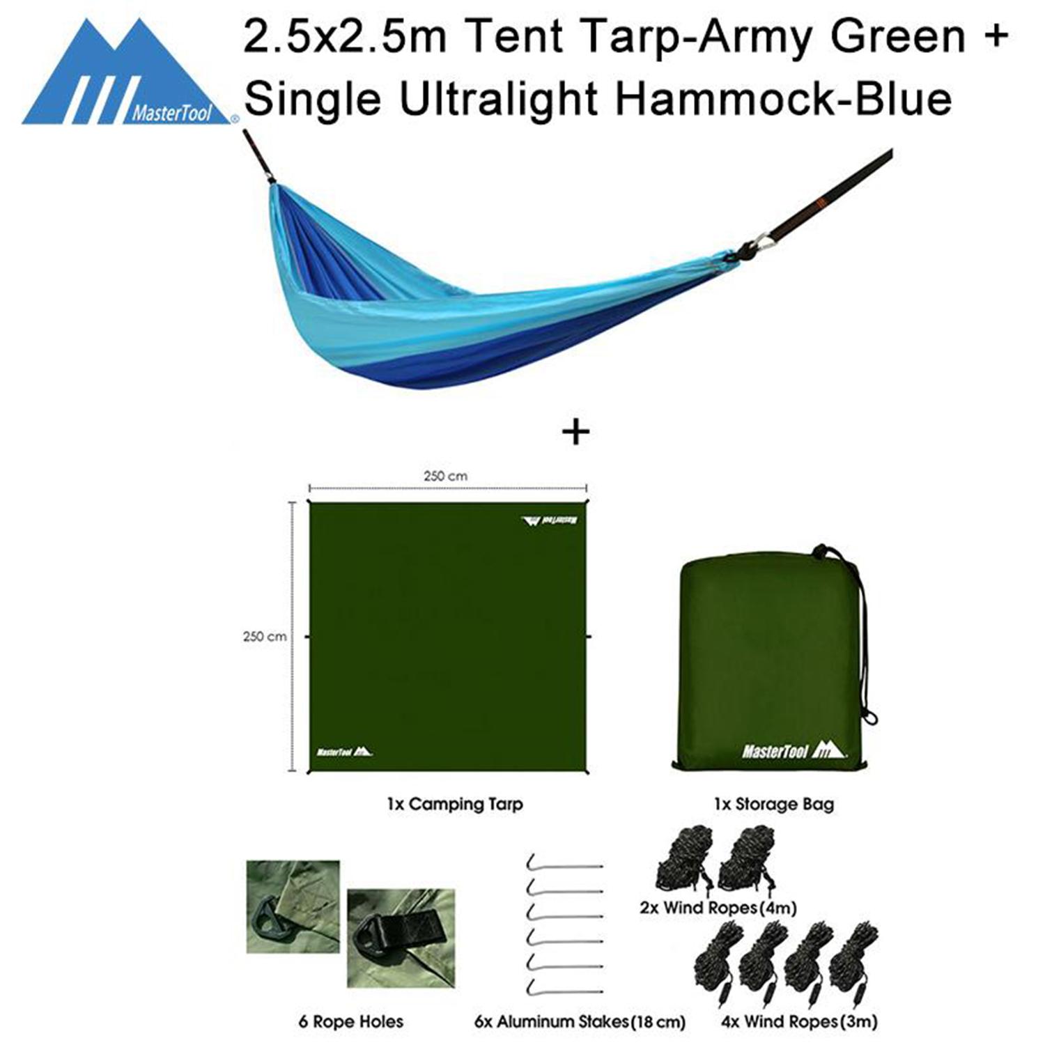 • 藍色單人吊床產品規格:315*145cm • 單人吊床折疊後尺寸:23*13*13cm • 天幕套裝內容: 收納袋 x 1, 天幕 x 1, 防風繩(4米x 2 , 3米x 4) , 風繩扣 x 6, 地釘 x 6 • 此套裝不含支撐竿,支撐竿可用行山捧或野外高物或樹幹代替 • 天幕尺寸:250x250cm