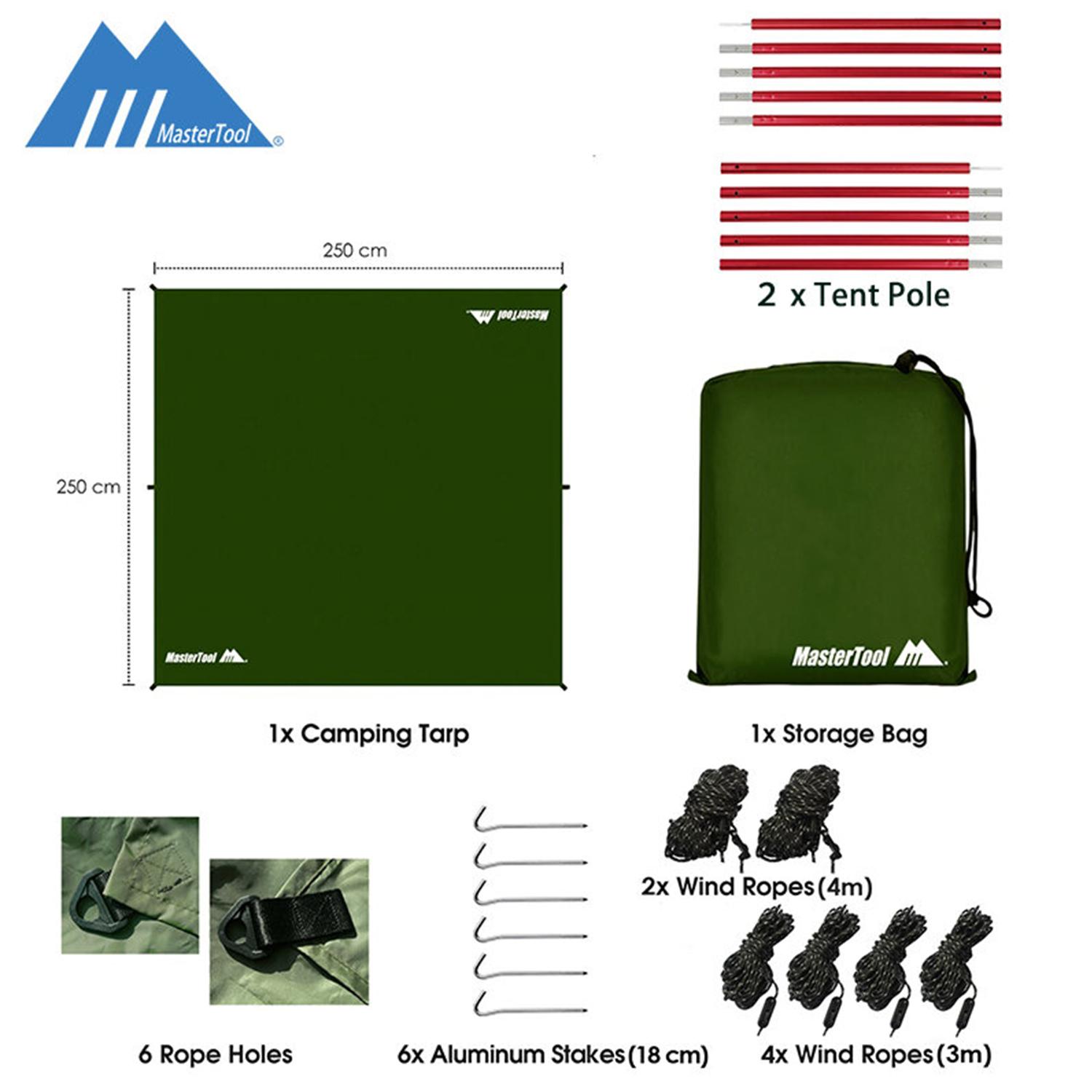 • 天幕套裝內容: 收納袋 x 1, 天幕 x 1, 防風繩(4米x 2 , 3米x 4) , 風繩扣 x 6, 地釘 x 6, 支撐竿 x 2(單支總長1950mm) • 天幕尺寸:250x250cm • 支撐桿尺寸:1950mm • 天幕+帳篷桿重量:1580g • 天幕重量:650g • 2pcs帳篷桿重量:930g