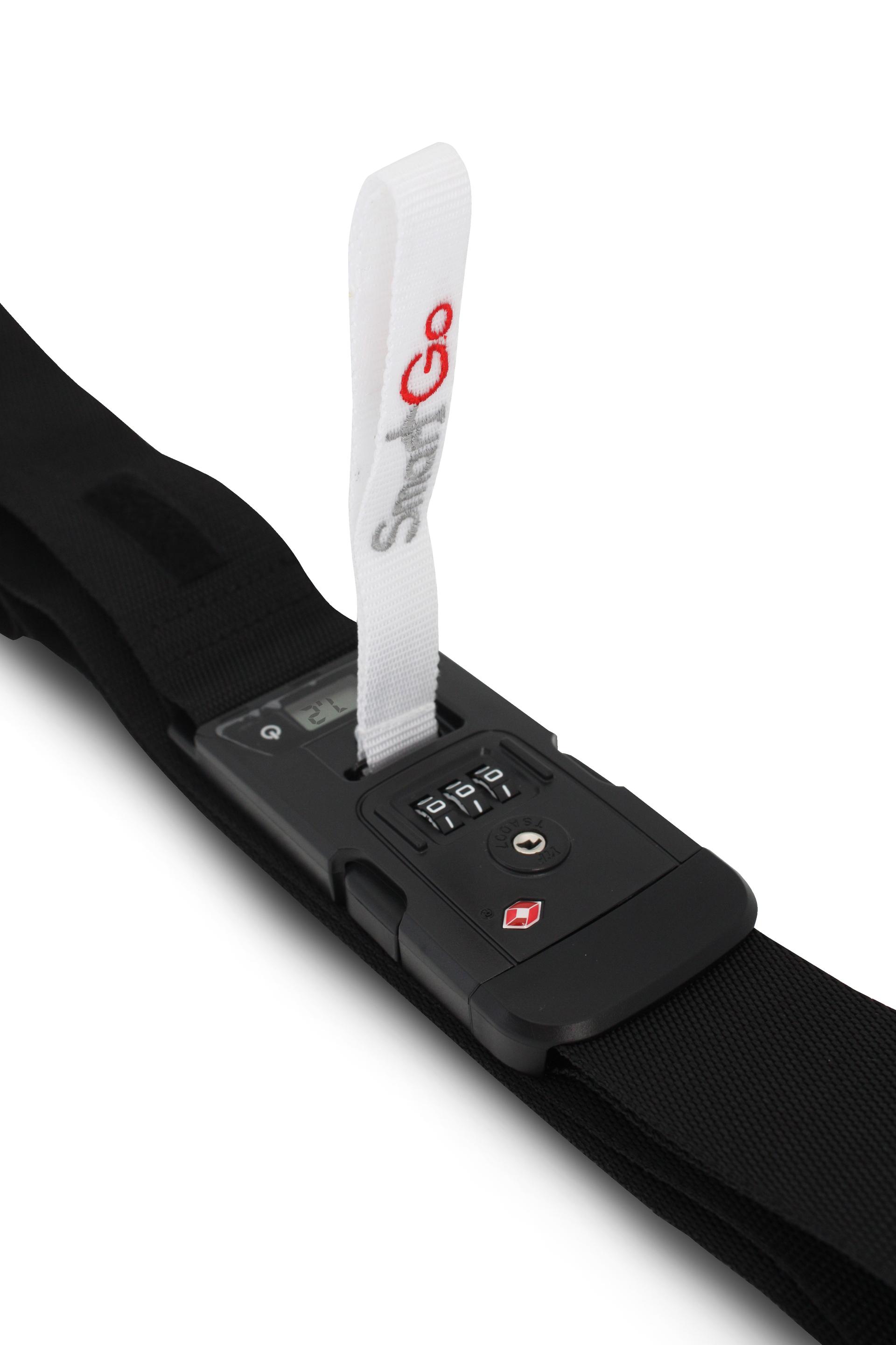獨特的3合1專利設計, 行李帶內置數碼行李秤, 讓您快速量度重量,避免行李超重需繳額外費用, 行李帶附有TSA認證的個人密碼鎖,保護行李, 伴您輕鬆旅遊。 3合1設計 (行李帶 + TSA密碼鎖 + 數碼行李秤) 3個位TSA行李密碼鎖 (獲Travel Sentry ®認證的鎖扣,能保障行李於轉機時免被開啟,並可以在不被破壞的情況下被美國機場保安開啟進行行李安檢) 數碼行李秤 (量度範圍:3公斤至35公斤) 公制和英制式單位 自動省電模式 可調節行李帶, 適合行李尺寸可達182厘米 (72吋) 包括2個LR44 (L1154)鹼性電池