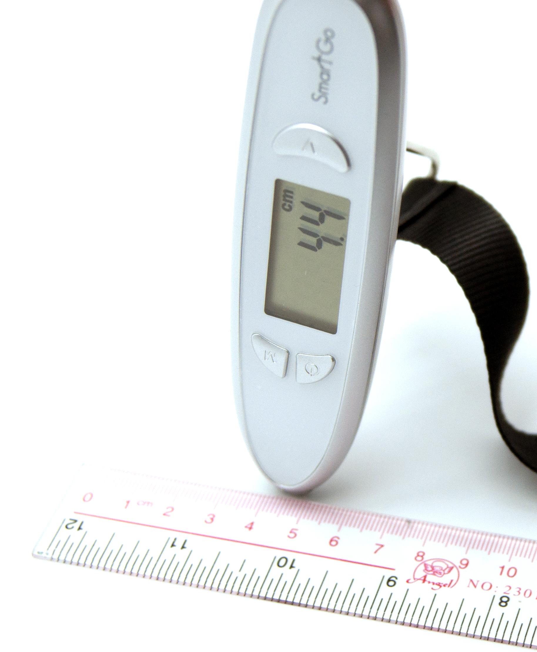 獨特的2合1設計, 無論居家或旅行,都方便使用 。幫您避免航空公司超重收費。 高精度應力傳感器 內建電子測量尺 標準重量自動校準 自動歸零及自動關機 自動體積計算 符合人體工程學的手柄和使用便利的帶子設計 稱重模式:公斤/磅 測量模式:厘米/英寸 最大稱重量/精度:50KG/01.kg, 110磅/0.2磅 工作溫度:10 〜 30 ℃ (最佳) 電源: 1xCR2032電池 外形尺寸:138(L)x35.3(W)x52(H)毫米 淨重: 130克