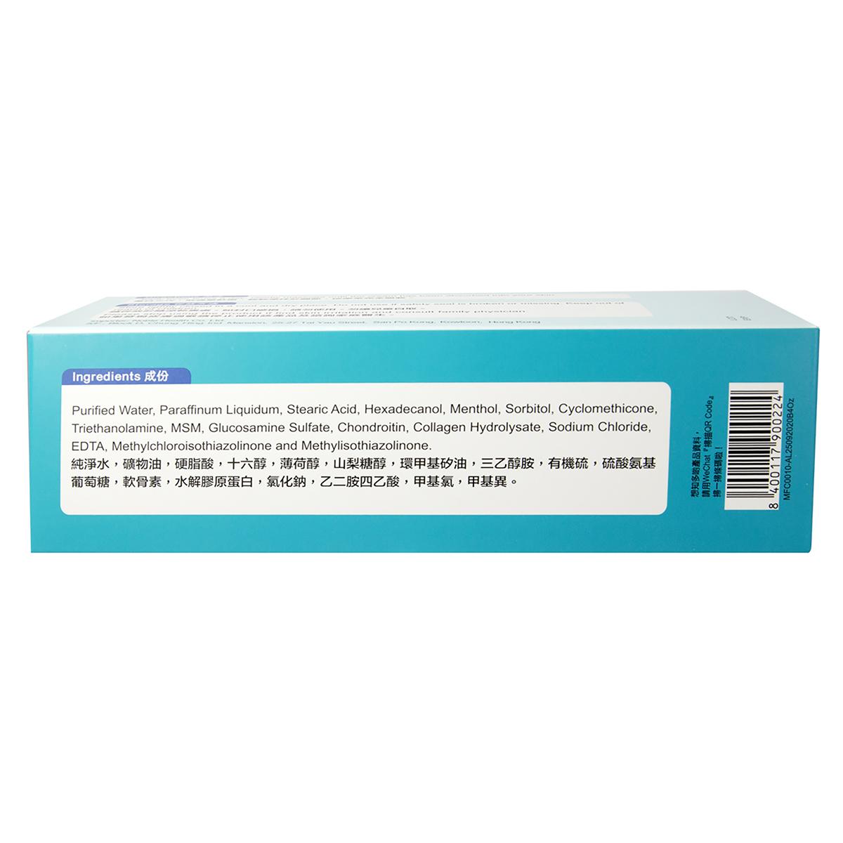 卓营方葡萄糖胺关节修护软霜为受关节健康问题困扰人士提供保护,包括过度劳动、肥胖、缺乏运动人士、低头族、年长者等。本产品配合4种高质量元素,包括葡萄糖胺、软骨素、胶原蛋白及天然有机硫(MSM),可促进软骨组织的修补,一抹即可渗透皮肤并直达痛处,适用于手腕、手指、膝头、腰背、颈椎等部位,是服药以外另一良择。
