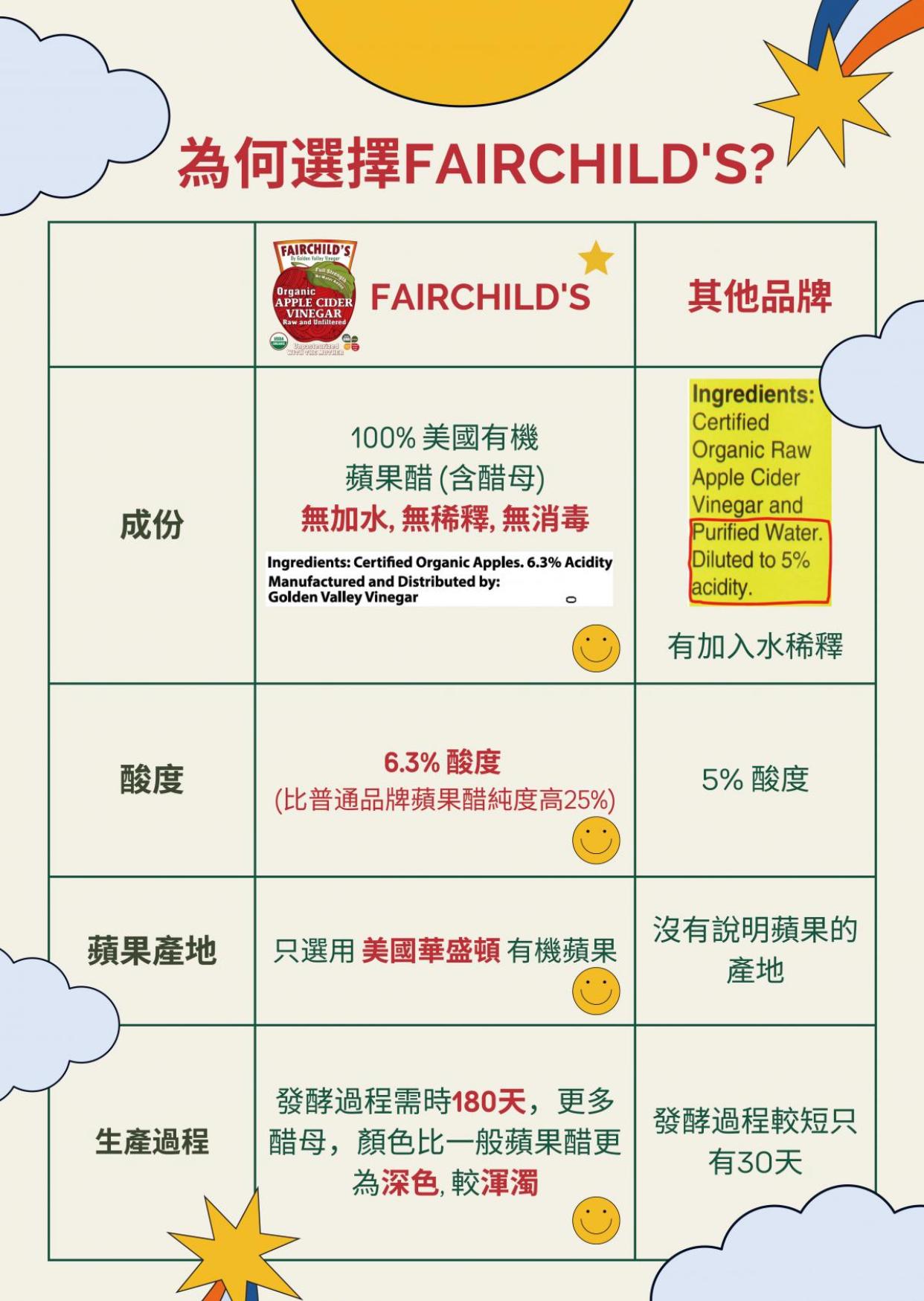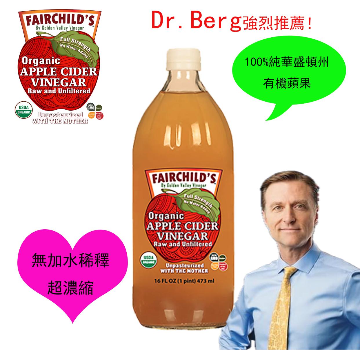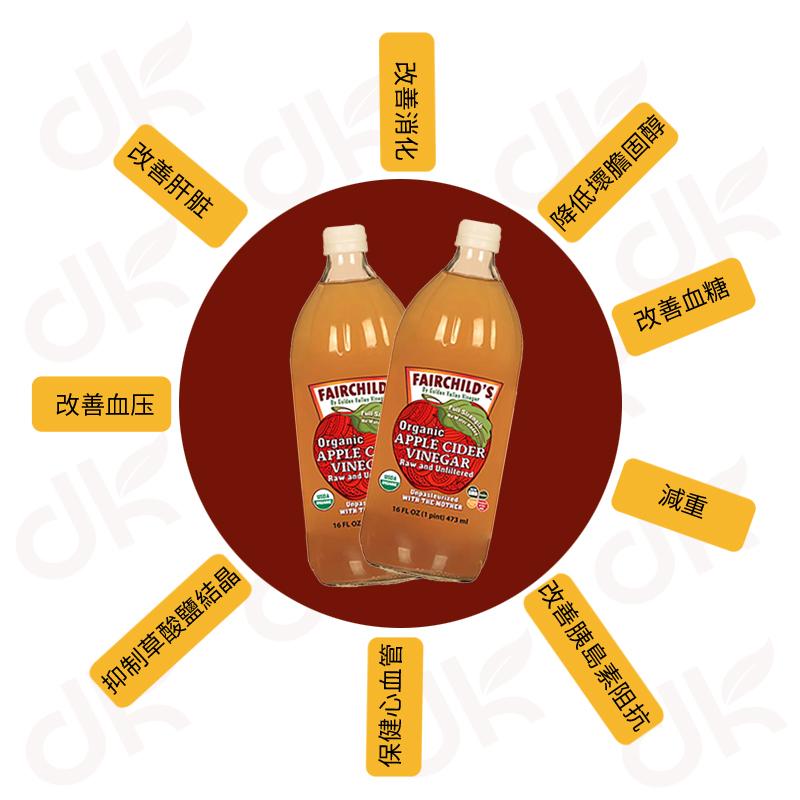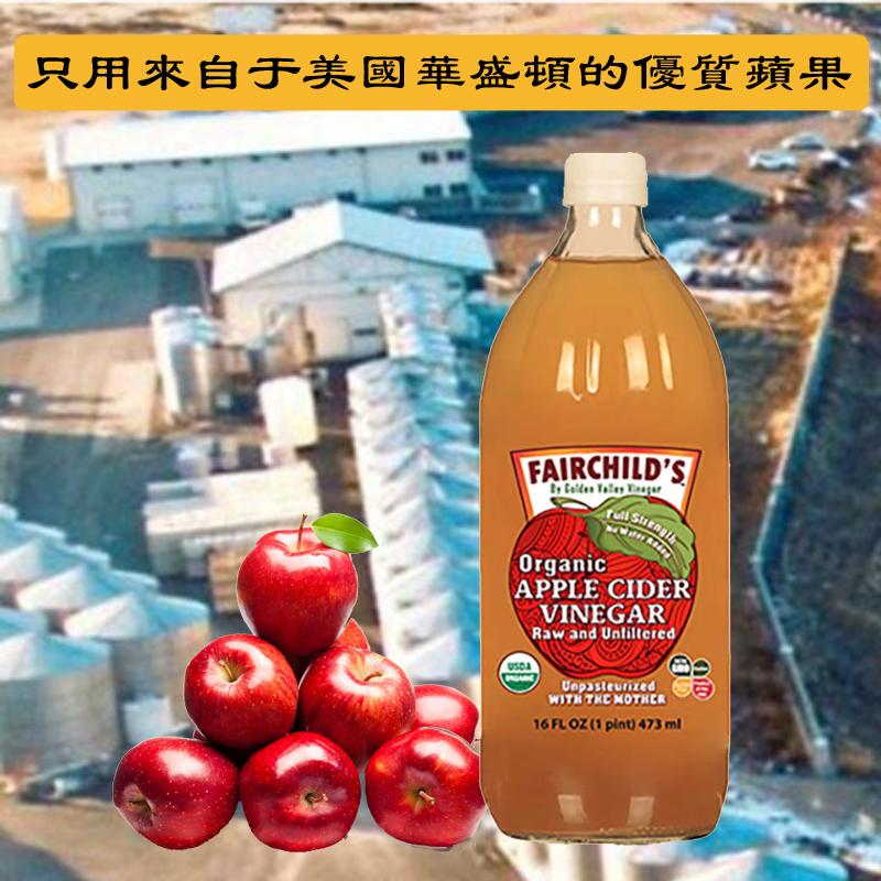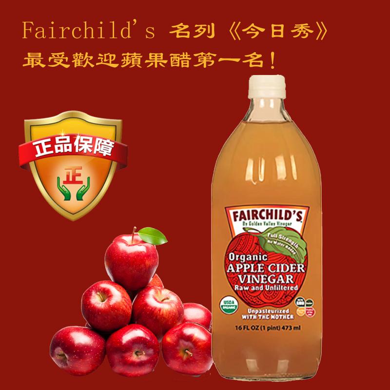 Fairchild's 美國有機蘋果醋只選用華盛頓州有機蘋果製造。 特點是沒有加入水去稀釋,酸度達6.3%比其他品牌的蘋果醋純度多出25%,其他品牌的蘋果醋一般只有5%。 由於沒有經過高溫消毒及過濾,所以保留了醋母及酵素。 成份:有機蘋果醋 原產地:美國 容量:473ml 保存期限:5年 好處: ⑦ 有助控制血糖 ⑦ 降低壞膽固醇 ⑦ 改善消化機能 此產品是非基因改造,無麩質,USDA 有機認證及猶太認證。 有沉澱物純屬自然現象。