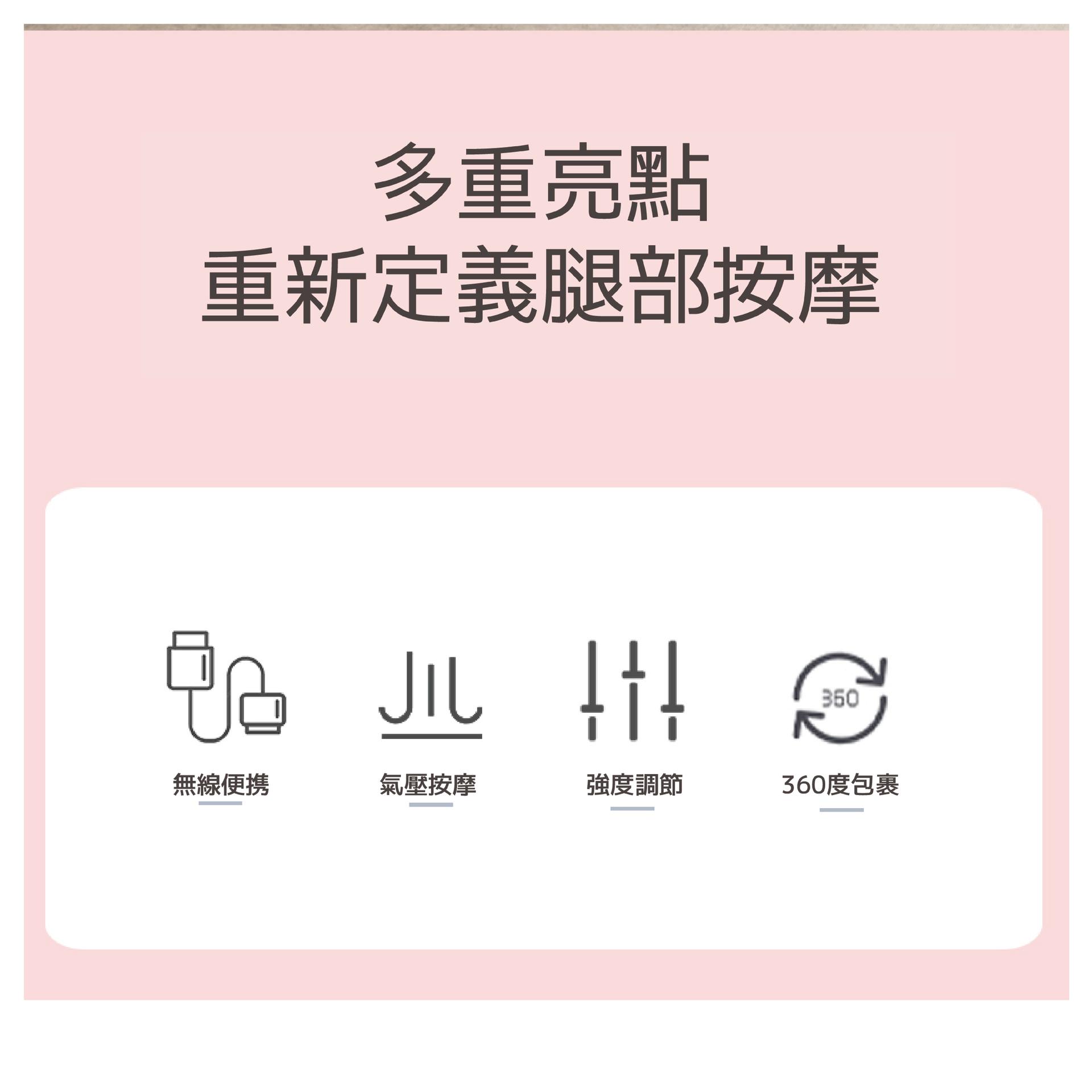 多重亮點 重新定義腿部按摩 #360全方位包裹氣壓按摩 #3種模式 #2檔力度 舒緩氣按師有效抒緩因工作、運動或旅行等引起的腿部疼痛,通過按摩去放鬆腿部肌肉,只需使用15分鐘就能快速消除肌肉疼痛;持續使用4週有效改善腿部靜脈曲張、運動損傷、水腫等腿部問題。