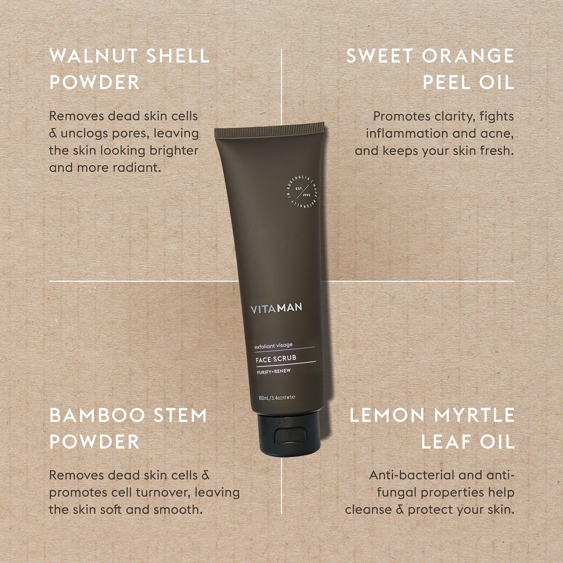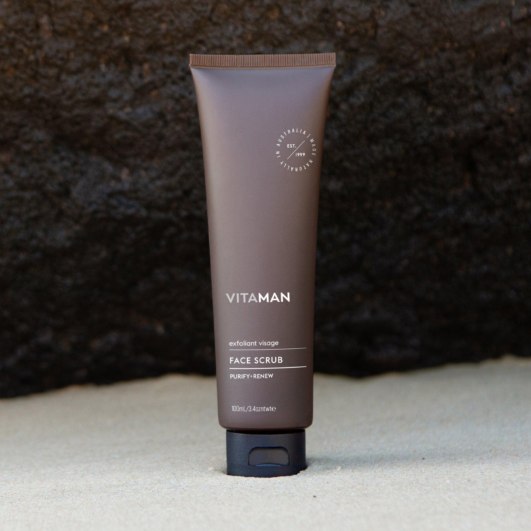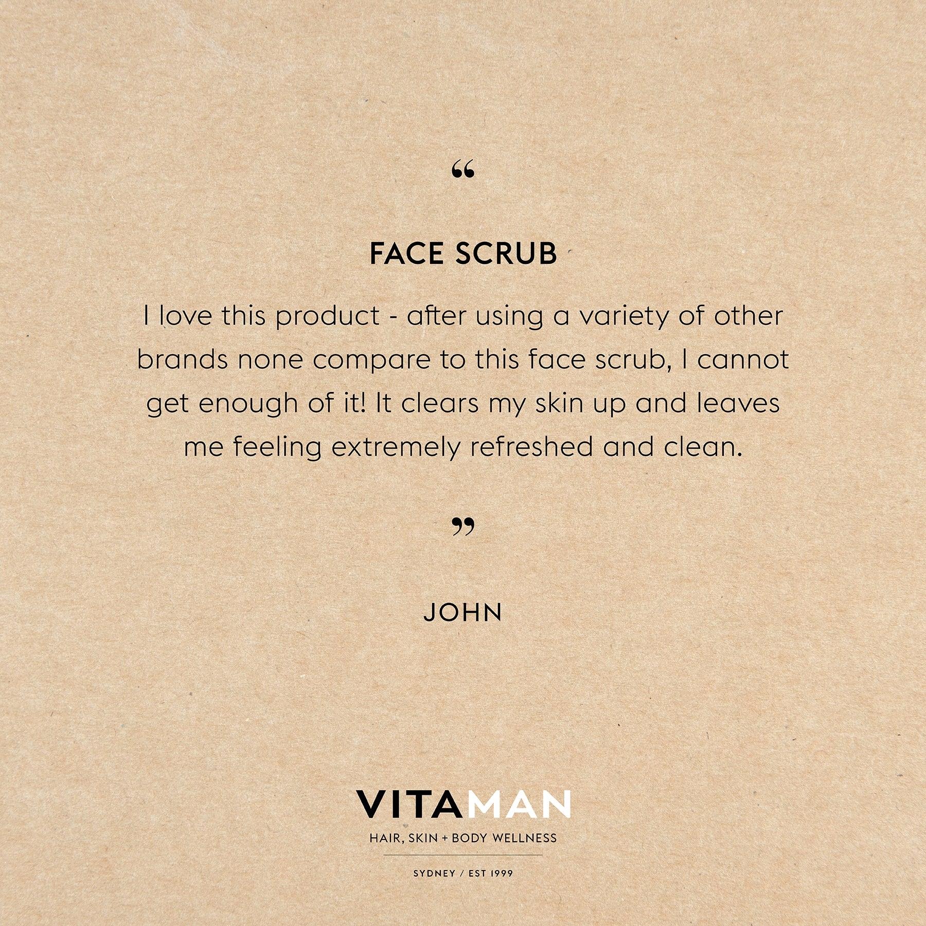 VITAMAN Face Scrub 煥膚面部磨砂膏 - 適合所有膚質 - 溫和地去除角質,讓疲倦、乾燥或暗沉的肌膚恢復活力 - 經常使用可深層清潔毛孔,幫助預防黑頭 - 定期使用可使皮膚更光滑,使剃鬚更容易 - 不含任何人工香料 - pH 值平衡配方