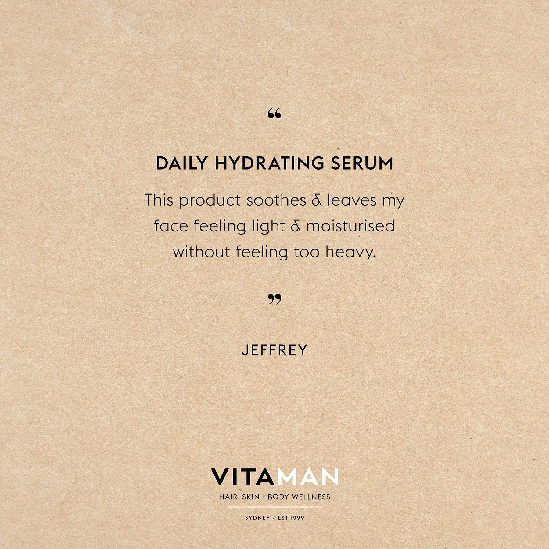 VITAMAN DAILY HYDRATING SERUM 男士深層保濕精華 - 適合所有膚質 - 含豐富抗氧化劑 A、B3 和 C,保濕前的強效打底霜 - 新配方添加美白抗衰老最強成份 - Vitamin B和Vitamin A - 對油性皮膚的來說是完美的防曬霜 - 超輕配方吸收迅速,保濕滋潤,啞光效果