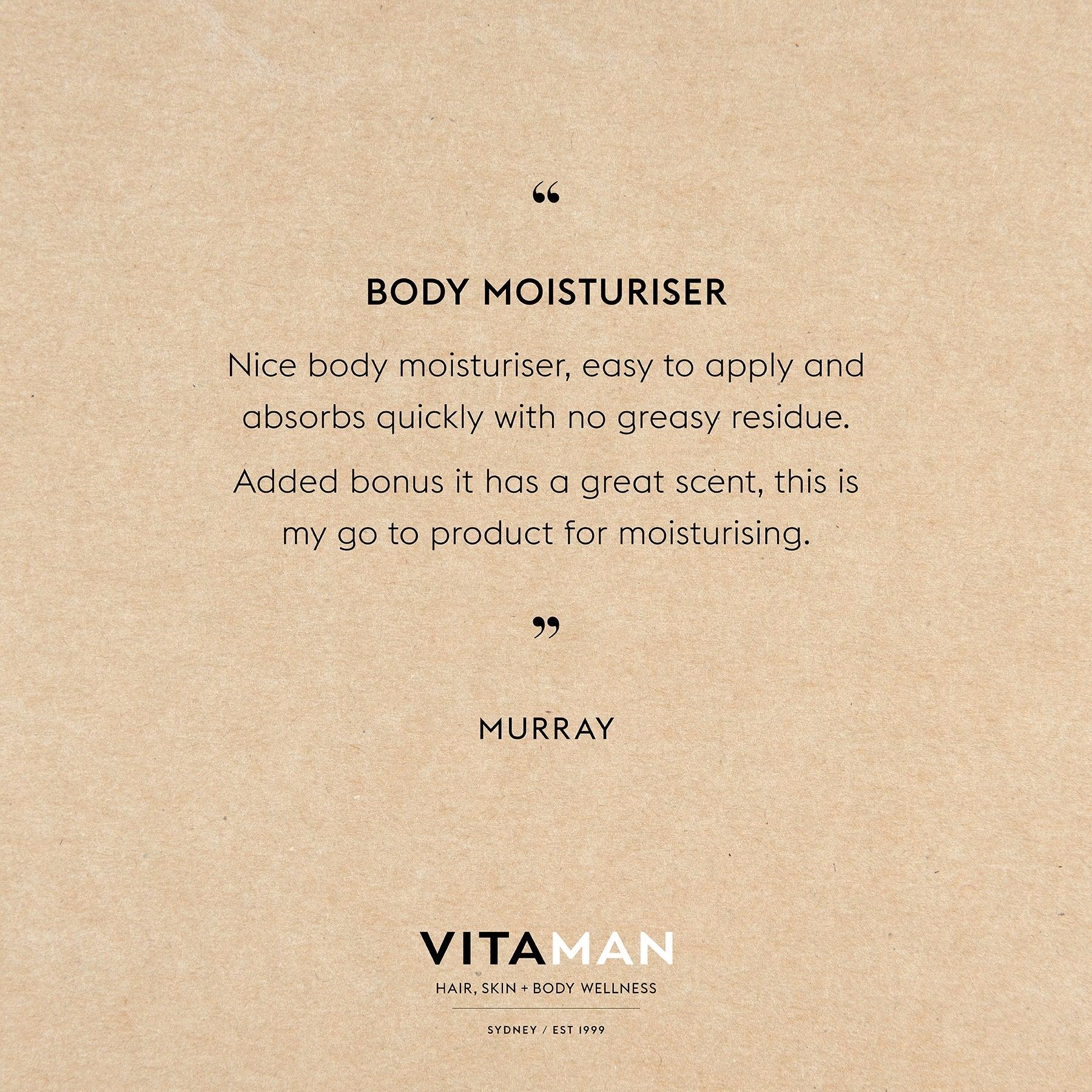 VITAMAN BODY MOISTURISER 深层保湿润肤霜滋养和修复:植物提取物协同作用,滋养肌肤,补充水分,恢复干燥、粗糙或干裂的部位(如膝盖、肘部和手部)的活力,让肌肤变得丝般光滑。保湿润肤霜的不油腻配方确保轻松涂抹,自信面对每一天。