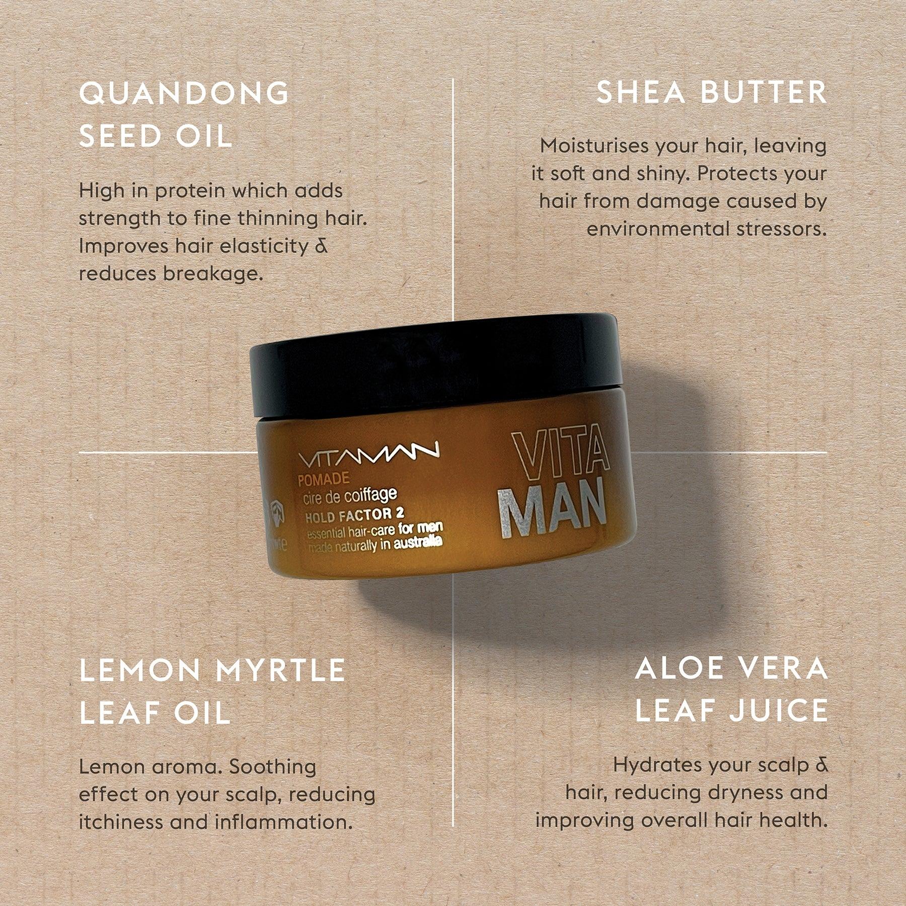 VITAMAN POMADE水性混合发油可告别僵硬、毫无生气的头发,让您的头发保持原位,同时让头发自然移动,不会产生油腻的堆积。发油采用水溶性配方,只需简单清洗即可轻松去除。其pH平衡成分可补充头发的天然成分,保持其最佳状态。